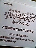 ‘ハッピーライフ、様からのお荷物……’と宅配業者の不在票にかいてあった。思い出せないが、なんかコモノの懸賞にでも当たったんだろー。と思っていたら、ヤクルトの蕃爽麗茶(バンソウレイチャ)1000ml×12本とMyエコバッグが届いた!!デカモノぢゃん!(ワタシにとっての高額賞品、の意・(笑))まー、あんなにハガキ送っといたからなー!(10通ぐらい(笑))「食事と共に」「糖の吸収をおだやかに」「血糖値が気になる方に」とか書かれた、厚生労働省許可・特定保健用食品だものー。すっげー!ワタシは幸いにして特に血糖値が高くはないけど、これはウレシーわぁ!なにせこの蕃爽麗茶、「グァバ茶」なのだ。ワタシは、無糖ならば、グァバ茶だのジャワティーだのルイボスティーだのちょびクセあり、のようなお茶がすきなので、今回のご当選には喜びもひとしおなのであった(笑)。
