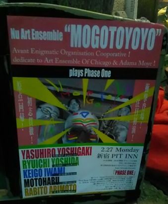 芳垣安洋(ds)氏の新プロジェクトであります。MoGoToYoYo (モゴトヨーヨー)are芳垣安洋ds 、吉田隆一reeds 、岩見継吾b 、元晴sax 、有本羅人tp,cl,bcl有本らびとさんは大阪のミュージシャンさんなのだそうです。新宿ピットインのライブに先駆けて、下北沢APOLLOで先行ライブ。どう考えてもこのハコでやるのは無謀ではないのかというギモンが。案の定、お客さんもメンバーもキッツキツです!!!(笑)芳垣さんの曲「Smokin'・・・・」がVincentAtmicusバージョンで演られてた。ビミョーなキモチ。メンバーもノリノリだったし、お客さんもノリノリだったしすっごい夜でした。新宿ピットインでのライブが楽しみ♪
