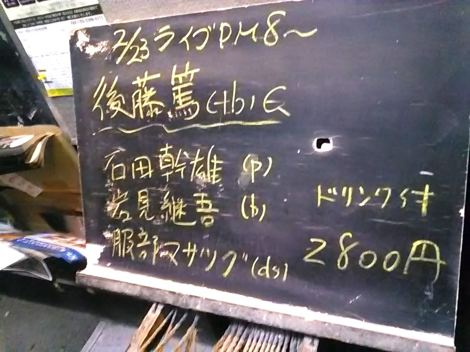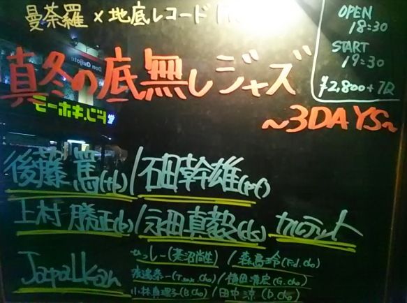 ■後藤篤カルテット are後藤篤(tb)、石田幹雄(pf)、上村勝正(b)、永田正毅(ds)1月下旬に一時高熱出たもんで口唇ヘルペスが鼻穴にできて赤鼻くそみたくなっているのでぜーーーったい見られたくない!とマスクしてライブ参戦!!これを聴くために赤鼻くそちゃんにもめげず吉祥寺までやってキタンダ。前に、アケタの店で、ギター小山道之さんでこのカルテットを演ってたけど今宵はピアノの石田幹雄さんです。その時とはまたちょい変わったカンジ。「Grand Open」のベースラインってホントいいなぁ。上村さんのクリアで緩急豊かな音色がその魅力を増長させている。トロンボーンソロもエネルギッシュでバラエティに富んでいて凄かった!後藤さんのソロがひときわ際立っていたのが「Goodbye Porkpie Hat」。もっのすごいかっくいーーー。膝叩いて「んまい!」と言いたかった(笑)。ずっとあのトロンボーン聴いていたかった。先攻のバンドは時間厳守、ということで言われているらしく、1曲削って終了になってしまい、あーあ終わっちゃったぁ感。あとでSNSでお聞きしたらば「ケ・セラ・セラ」だったそう。聴きてかったよ~。ま、食事と一緒で、ちょい足りないぐらいが最適なのかも♪■ヤパルカン(JAPALKAN) areひっしー(菱沼尚生)(fh,vo)、森島玲(fdl,cho) 渡邊恭一 (ts) 小林真理子 (b) 横田清宏(g)田中涼 (ds)そして初聴きのこの菱沼さんのバンド、なんと、バルカンミュージックだそうなのです!わかんない!!(笑)はじめ、度肝を抜かれた菱沼さんのパワフルヴォーカルにしばらくあんぐり。ぼうぜんとただただきょろきょろと可愛い衣装のメンバーさんたちを見ながら、初めての音の紡ぎを耳で拾うのに精いっぱいでした。なんだこれ!なんだこれは!と、どんどんくせになるカンジがおもしろい♪全然、ただのおもしろバンドじゃない演奏のハイクオリティ!ギターのエフェクターがたくさんセットされてたけど、そんなに目立った変換はなかったように感じられ、けどこのバルカン音楽というものにとってもマッチした音色で聴きやすい。菱沼さんのフリューゲルホルン、横にピストンがついてた。あとでお聞きしたらば、ドイツのはそうなんだって!へぇー。とてもバラエティ豊かで、全体的な印象としてはダンス音楽と感じました。スタンディングのとこなんかだと楽しく踊れるかも♪ほんとに菱沼さんってなんでもできるんですね。若いのに!おそるべし(笑)!注目のバンドです♪