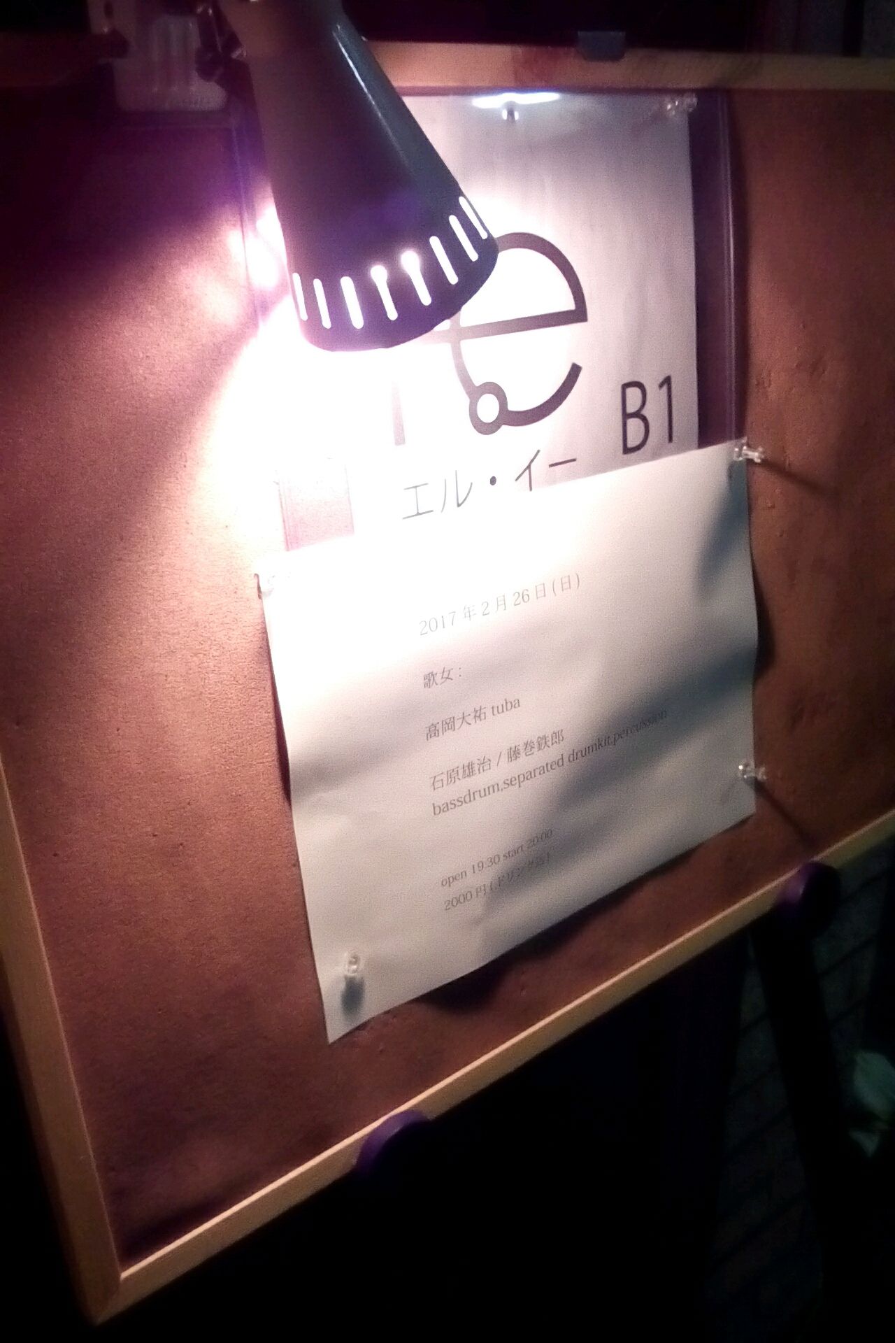 自宅から徒歩4分に位置する「le (エルイー)」というライヴもやってるギャラリーで「歌女(kajo)」を聴いてきました。open19:30/start20:00¥1,500+1drink高岡大祐tuba/石原雄治&藤巻鉄郎