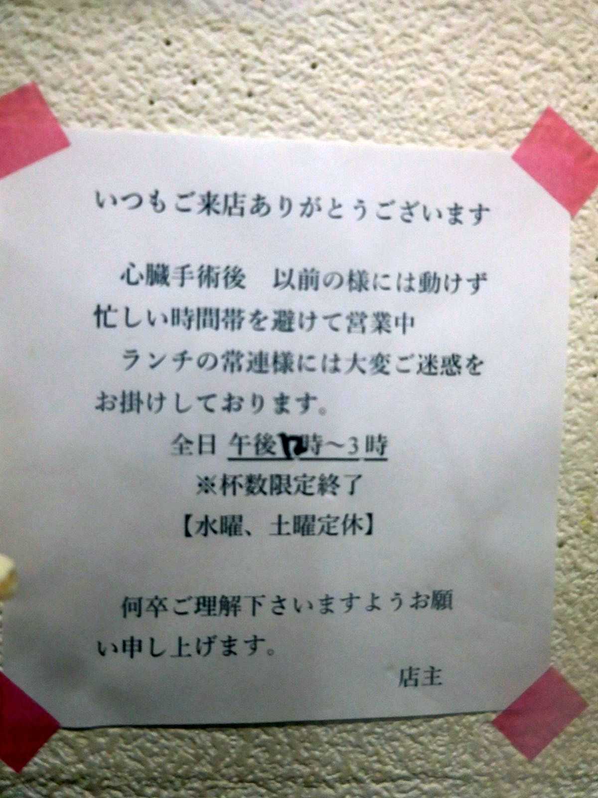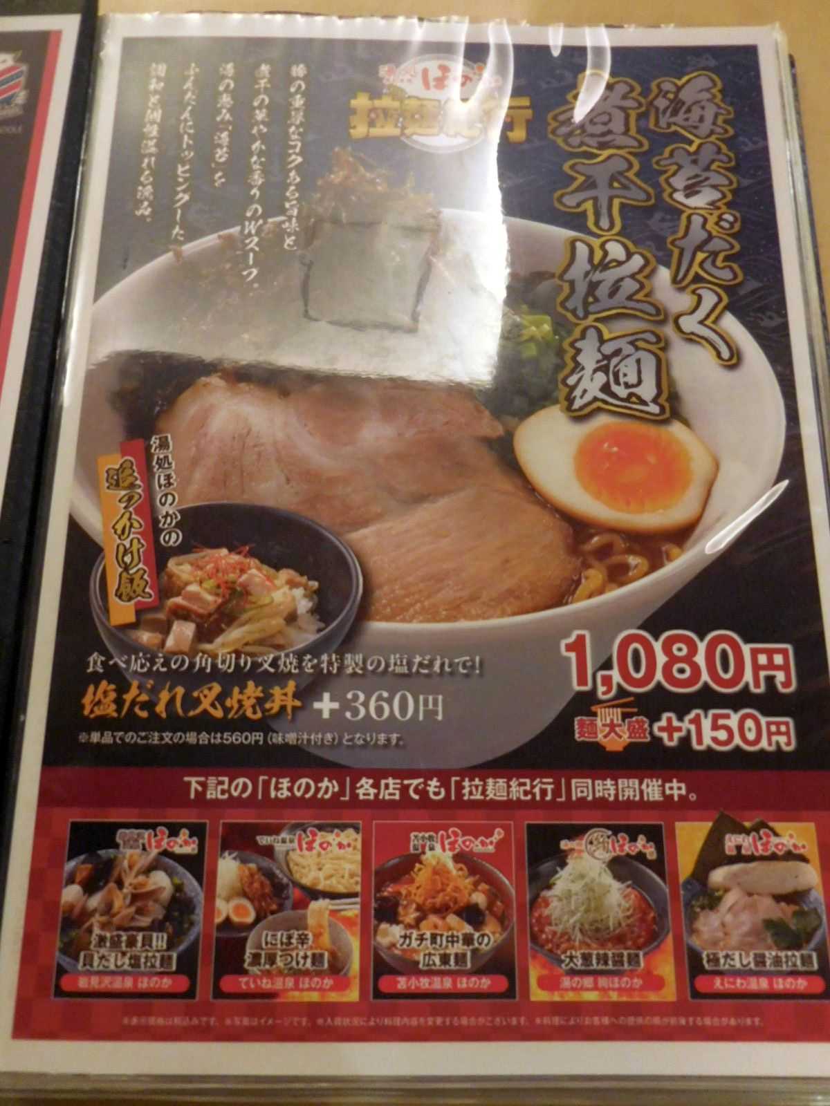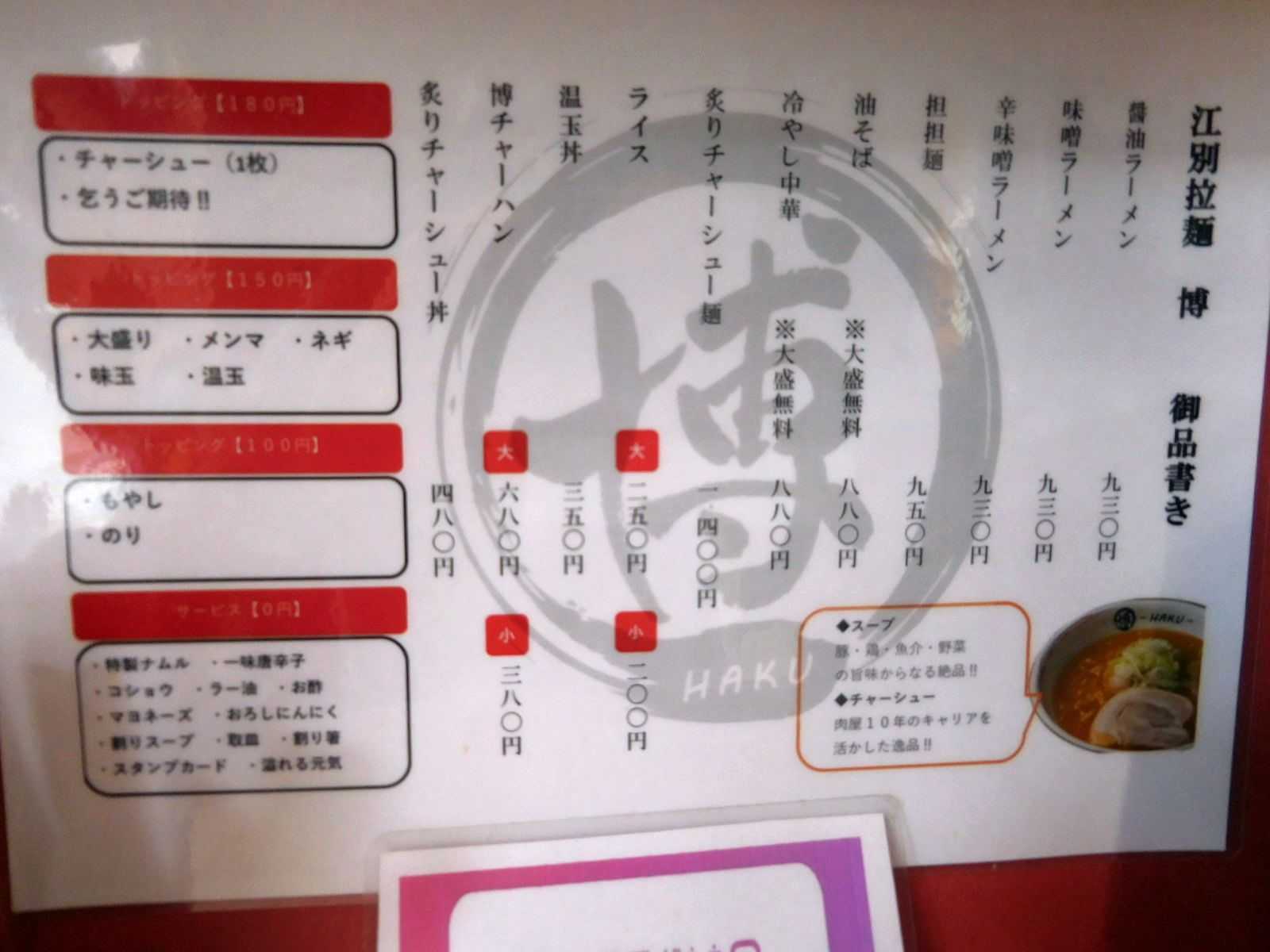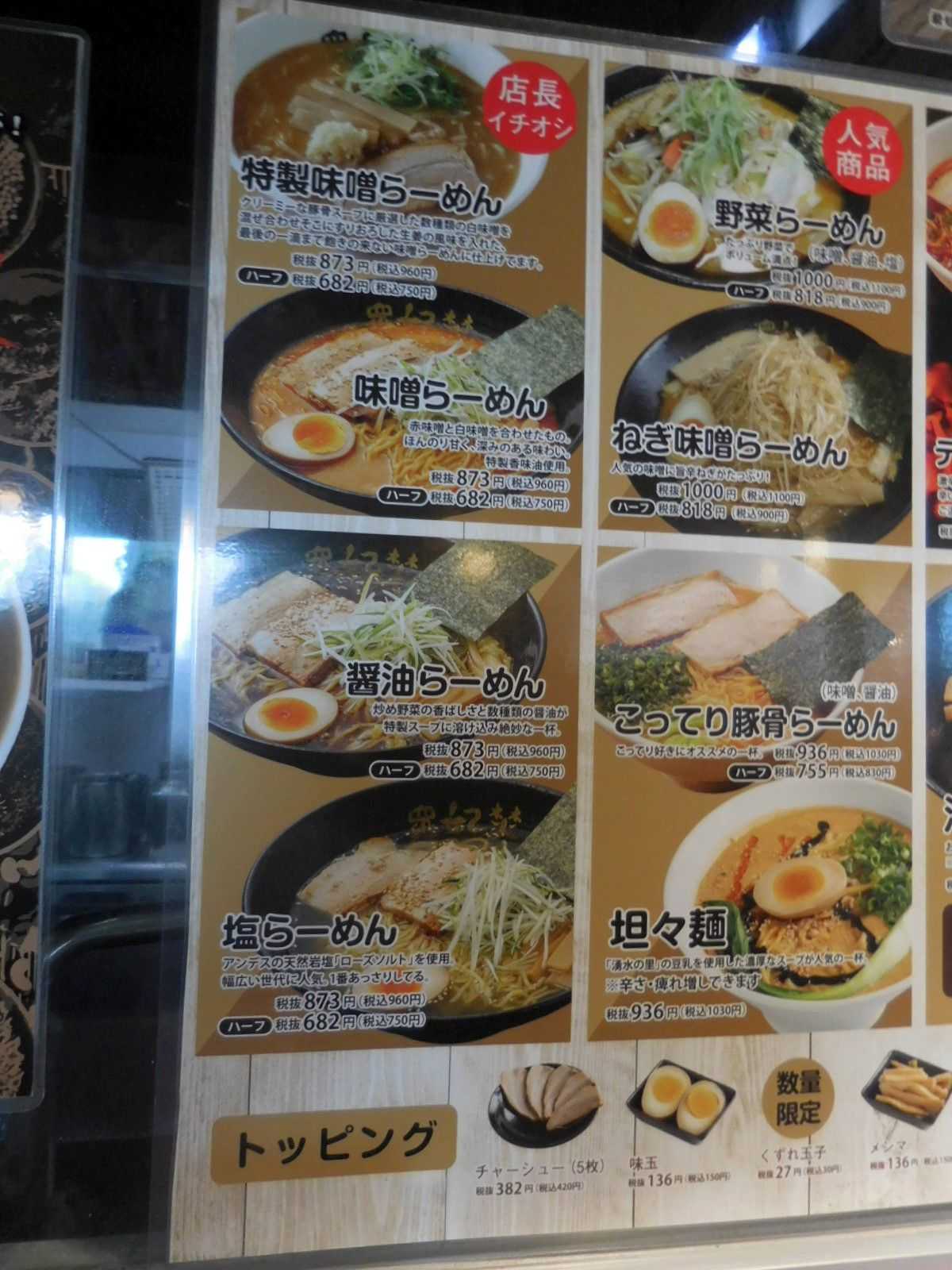 今日は、江別市役所で行われる焼き物市が始まったのですが、今年は引っ越しがあったので、まずは不在者投票のため向かいました。 混んでいるとは聞いていたのですが、、駐車場に入るのに1時間待ち・・・。で、駐車場内に入ってみると結構空きスペースがあるように見受けられます。よく見てみると、駐車場の出入り口には誘導員が配置されているのですが、駐車場内には誘導する人が見当たりません。で、出入り口の誘導員は適当に駐車場に車を入れることになるので、駐車場へ入るまでに時間をとられるようです。駐車場内に誘導員がいないので、空きスペースを見つけるのもあっちへ行ったりこっちへ行ったりと時間をとられます。せっかくの有名なイベントですのでもうちょっと何とかならんものでしょうか。 で不在者投票含めて2時間ほど時間をとられてしまったので、野幌のしょうにお邪魔しました。 前回行ったときの様子がこちら。 メニュー再掲。 冷やし中華を始めたようです。ご飯ものがないようです。で、前回気になっていたトンカツラーメンを醤油、大盛りでオーダーです。揚げ物なので10分ほどの待ち時間。でこちら。超分厚いカツがどーんとのっています。ただ、食べ応えがあるカツなのでもうちょっと薄い方が食べやすいかも。すっきり系のスープにトンカツがよく合います。帰りにサービス券を頂きました。ご飯100円引きサービスが、トッピング150円引きサービスに変更されています。【送料無料※北海道・沖縄対象外】【代引払い不可】【ご家庭で手作りソバ打ち】めん打ち太郎 60cm 包丁付(そば打ちセット)(レシピ付)(16882-7)NHK趣味悠々 名人・高橋邦弘 こだわりのそば打ち入門 vol.2 [DVD]