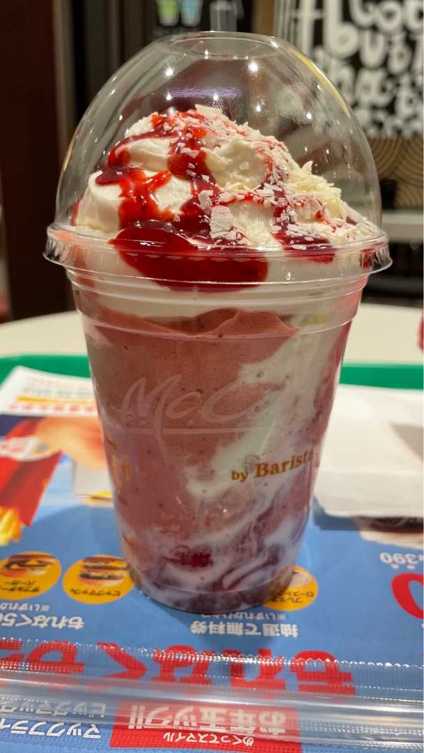 こちらは先月購入した期間限定のストロベリーフラペチーノです。マックカフェはカフェチェーンの中で安い方だと思います。