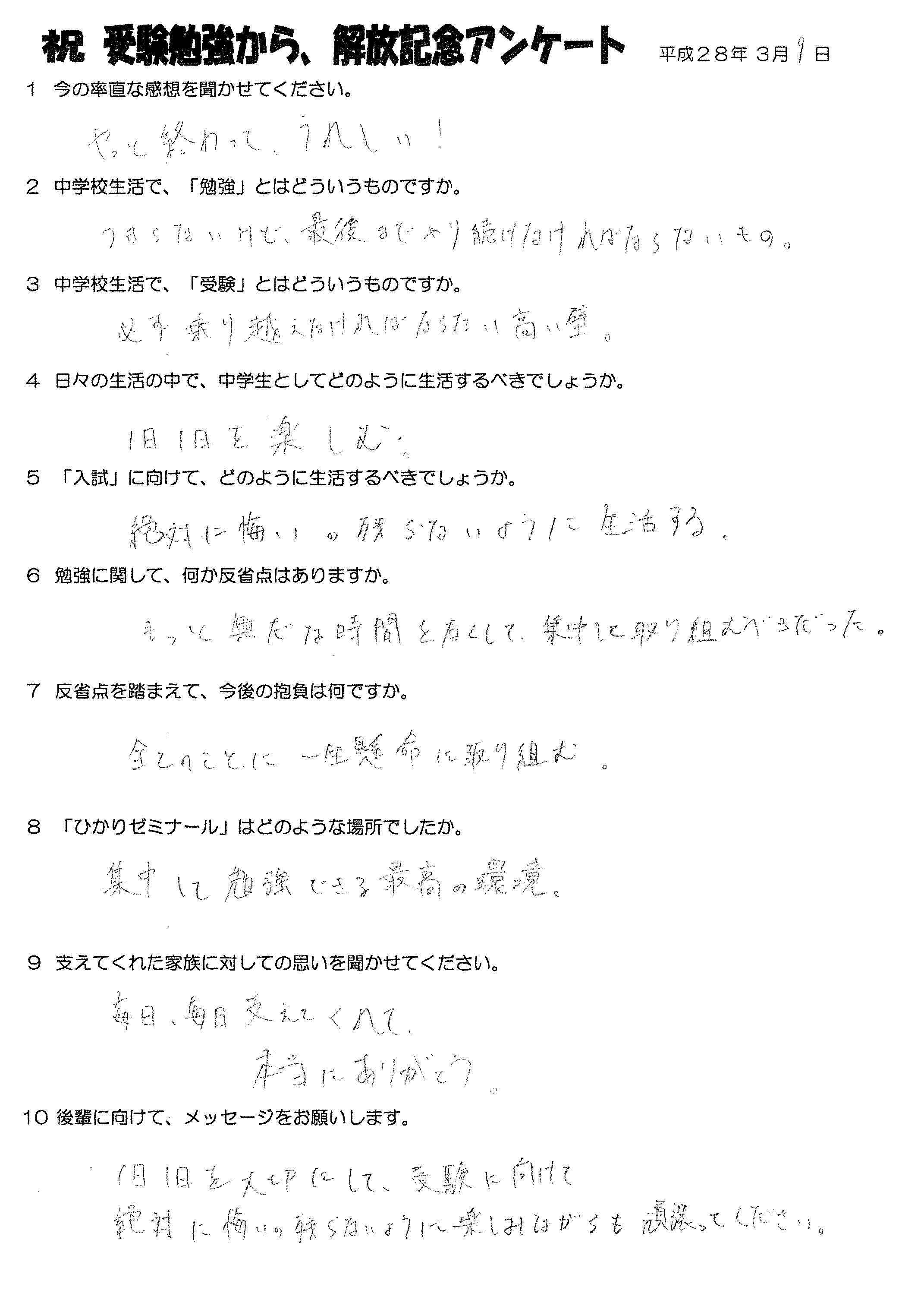 テスト前の中学生が、月曜・火曜と放課後からテストの準備に励んでいる。夜の授業終了後、中3男子が朝から塾に来たいと言い出した。「時間は?」「6時から8時までです。」「直接学校に行きます。」他塾さんでテスト前に朝から指導されている話は聞いたことがある。でも、ウチはやらない。夏休み中に朝10時から自習室を開放しても寝坊する生徒もいる。そんな状況で朝6時に来るって信用できるか?朝6時に起きたのならば、ゴミ出ししてラジオ体操でもすればいい。そもそも先日の日曜日、午後から自習可能と伝えていたのに来たのは女子2名だけ。ウチは指導時間多いほうだと思うが、気まぐれヤル気の勉強には付き合わない。普段から時間を完全に有効利用しているならば10秒くらいは考えてもいいが、今回は即却下。確認したら、学校の自習時間に勉強せずに友だちと話していたりするようだ。睡眠時間削る前に、他の無駄な時間を有効利用しなさい!まだまだ気分で勉強しようとするとは…甘い!ひかりゼミHPはこちら
