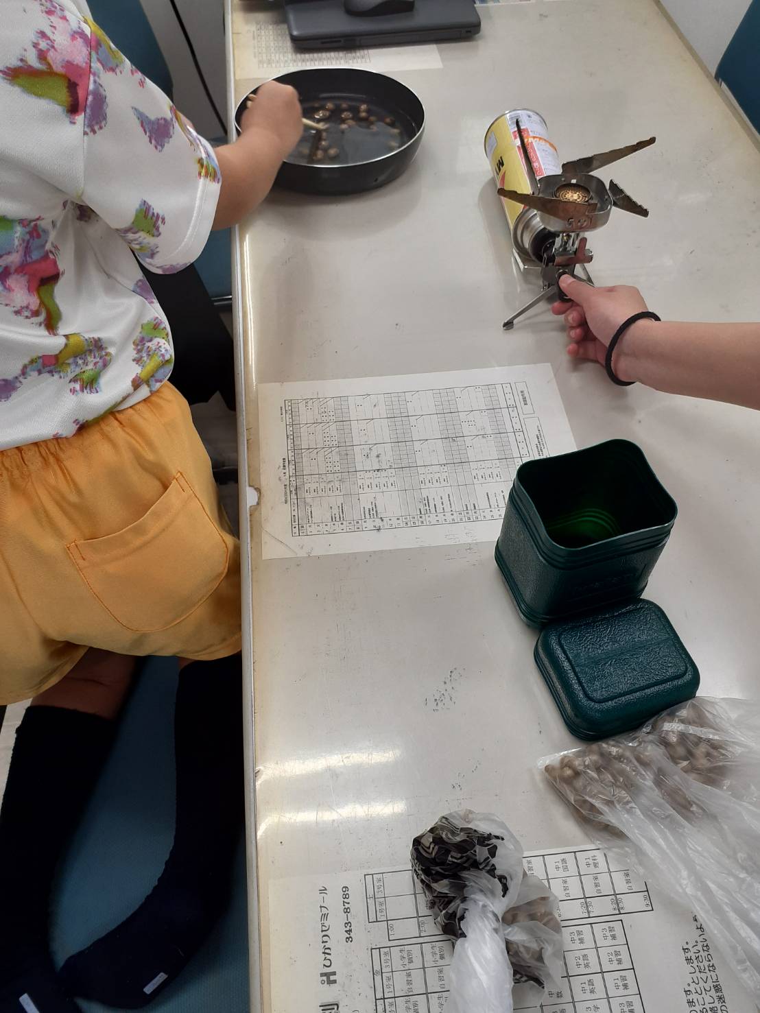 今年も駐車場のむかごを収穫。夕方に中学生と一緒に傘をひっくり返して集めていたら、水曜日のちびっ子も登場。みんなで集めて、3家庭がお持ち帰り。一部は教室で塩茹でしてみんなで美味しくいただいた。手前の袋の中が持ち帰り用。ご家庭で美味しい「むかごご飯」ができたらいいけど。何故か塾にあるキャンプ用のコンパクトバーナーとフライパン。ちびっ子もお手伝い中。