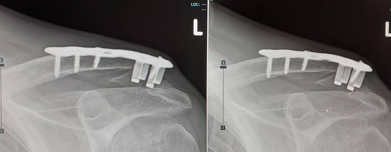 この記事の続き。月イチペースでレントゲン撮って経過観察はしていた。最初の2ヶ月ほどは順調だったがその後の治癒が進まない。9月になって主治医さんと色々話してるうちにわかった。「動かさなかったこと」が原因で骨が接合しないらしい。普通、これって逆を考える。早く治るようにと思って3ヶ月左肘を体にくっつけて生活していた。そんな状態で動かさなかったらそれが原因で治りが遅くなるらしい。本塁突入のサードコーチャーみたいにぐるぐる回せと言われた。そんなの聞いとらんしwってことで、プレート除去手術をする。11/29(金)朝から入院して即手術。11/30(土)昼に退院して、ワンコの散歩行って教室に来て中3授業の予定。プレート埋め込みよりも負担が少ないらしく、コレでいけるでしょ!Cちゃん先生、金曜日の教室運営お願いしま~す。金具の下の骨の裂け目の隙間がある。この部分が繋がっていないらしい。CTで角度変えて見るとほかの部分は繋がってるので大丈夫だろうってことらしい。