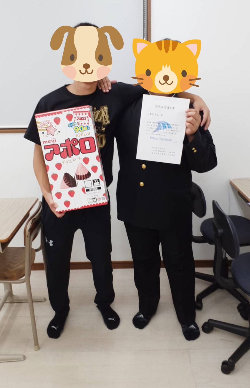 土曜日夕方、生徒たちが夕食で一時帰宅している時間帯「こんばんはー」と声が聞こえた。出てみると、17期のST。熊本工業高校の工業化学科の3年生。この時期に熊工の生徒が来るってことはそういうこと。「就職決まりました!」「どこ?」「三井化学です」おお、財閥系の大企業!よっぽど成績良かったのかと思ったら大したことはない。熊工はコレがあるからなー。ガチ運動部(サッカー部)を3年間続けたら高く評価されて簡単に就職が決まる。ホント、高卒で就職を目指すならば県内で最強の高校だろう。するともう一人現れた。これも17期、熊工の工業化学科のOT。こちらも進路が決まったという報告。意外にも(失礼!)成績が良くて、学園大の指定校推薦を貰ったらしい。甲子園のグラウンドには縁がなかったが、熊工野球部で3年間鍛えられた。大学でも続けるか迷っているらしいが、今度は熊本四大学で上位を目指してやってみれば?二人とも、おめでとう!次のステージでの活躍を祈ります。内定通知書より差し入れのアポロのほうがでかい!財閥系の企業の高卒初任給は一昔前の大卒初任給と同等だった( ゚Д゚)ひかりゼミHPはこちら