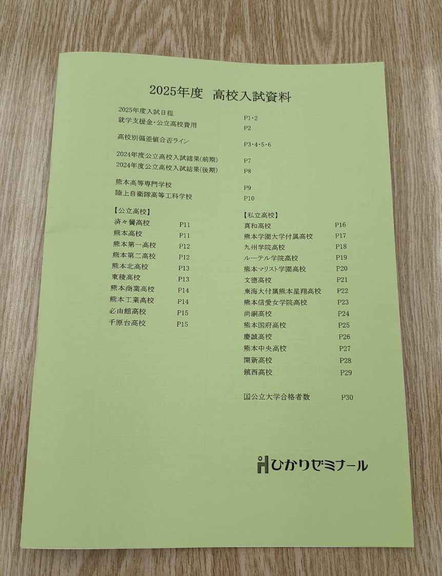 11/17(日)中3の三者面談開始。中学校の教育相談に先がけて受験校をある程度決めることになる。そのために先週まで作成していた資料がこちら。毎年作成しているので、PC内には過去のデータも全て残っている。中身はこんな感じ。中学校でも「進路案内」という完成度が高い冊子を配布している。しかし、せっかく塾屋が作るのだから、中学校と違った情報を提供しなければいけない。そこで塾だからこそ提供できる情報が各高校の入試の偏差値と合格点。特に私立高校は特待・奨学のランクごとに細かく点数を公開してくれることが多い。また、受験者数・合格者数も教えてくれる。「〇〇高校は難しい」とか「△△高校は通りやすい」とか一般の保護者さんや生徒は知らないことが多いだろう。それこそ都市伝説のような噂話が広まっていることもある。だから塾に来ている生徒・保護者さんにこちらが知っている多くのデータを公開する。兄・姉がいて、最近の熊本の高校入試をご存知ならば問題ない。しかし、子どもの初めての受験や他県から転居されたご家庭など、知らないことも多くなる。「特待入試って難しいんでしょ?」「ウチの子は一般入試で十分です。」「いいえ、最近は殆どの受験生が 特待入試を受験します。」「一般入試は特待より高倍率になります。」こういった情報から保護者さんにお伝えしなければいけない。受験生には毎年話す。「あなたたちの周りの大人で 熊本の高校全般について 一番よく知っているのは僕です」日曜日から中3の生徒・保護者の皆さん、宜しくお願いします。ひかりゼミHPはこちら塾生以外の方でも知りたいこと、疑問点がありましたらご連絡ください。知っている限りのことはお伝えします。