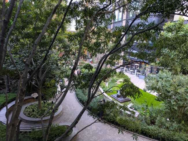 作品鑑賞後、二階の廊下に出て外を見下ろすと、いつも緑がきれいな中庭のながめが。