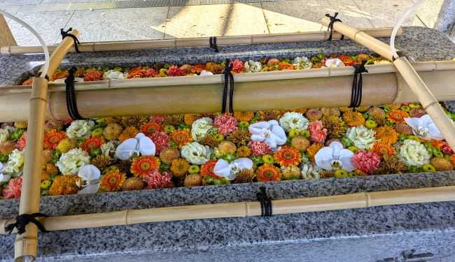花手水(はなちょうず)は、神社やお寺の参拝前に手や身を清める手水舎の水の中に花を浮かべたもので、最近よくみかけるようになったのは、写真映えすることからSNSなどで紹介されることが多くなったからかもしれません。発祥地は、京都・長岡京にある「柳谷観音 楊谷寺(やなぎだにかんのん ようこくじ)」だそうですが、お寺さんではない一般家庭の手水鉢に花を添えるということは、もっと昔から自然発生していたのではと思われますよね。そもそも、花手水というのは、「水のない場所で手を清めるのに露のついた草花などを使うこと」を言ったのだと、どこかで耳にしました。また、神社などの手水舎に花があしらわれることが増えたのは、コロナ渦に感染拡大防止の観点から手水舎の利用を中止するところが多くなって、かわりに花を飾って手を洗えない代わりに、目で見て心を清めてもらおうという神社やお寺もあるのだとか。近所の富岡八幡宮の花手水(2025/10/30)なんにせよ、花は見るだけで目にも心にも、良い効果がありますね。ネットニュースで「深川花手水(期間は2025年10月24日~31日)」という名前でお寺や神社だけでなく、門前仲町界隈のお店屋さんの店頭などにも花手水を並べているというので、近所だし、買い物がてらぶらぶらと花手水見物にでかけてみました。永代通りから富岡不動の鳥居をくぐってすぐ左手、たまにお惣菜を買う伊勢屋さんの前に。このまままっすぐの成田山東京別院深川不動堂までの150mほどが「人情深川ご利益通り」と呼ばれ、両側に並ぶ店舗の前に花手水が沢山みられました。おせんべいを買う其角さんの前にも、京漬物の近為さんの前にも、ほとんど軒並み、花手水が置かれてます。お店屋さんの雰囲気に合わせたものもあり、説明が添えられたものもあります。こんなグリーンを背景にしたのもいいかんじ。みんな違って、みんないい。中ほどの右手にある永代寺の花手水不動尊に到着です。(もうすぐ酉の市ですね。)手水舎はカラフルな花であふれていました。久しぶりにお参りをして、御朱印をいただいていきましょう。川越の不動尊とコラボしているそうですが二枚並べるデザインが面白かったので。(川越にも行かなきゃですが、ちょっと遠いにゃ。)たまたま、お花を入れ替えているところがあったので、聞いてみたら、近くのお花屋さんが手分けしてデザイン管理をなさっていらっしゃるとか。いくつか見逃していますが、パンフレットによれば、47か所に花手水が置かれてあるようです。この企画、2022年くらいから始まったようですが、だんだん数が増えているようで、次回が楽しみです。※江東おでかけ情報局の花手水のページhttps://koto-kanko.jp/special/detail.php?spid=54