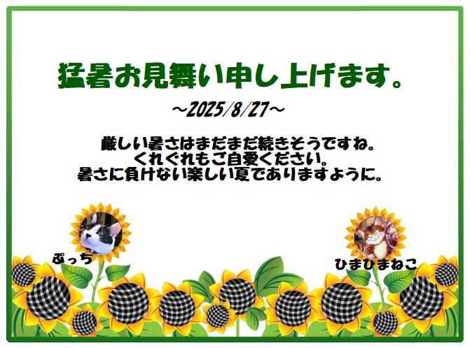 ミンミンかあさんが天国に召されてしまったのは今年の二月でした。あと何日かで満19歳と言う高齢だったのと、少しずつ高齢化していく様子を日々目にして、私自身の心の準備にも充分時間をかけられました。当時、三にゃんいた猫は一番若いプッチでさえ人間にしたら還暦をこえたので、「人も猫も我が家の平均年齢たかいにゃ~。!」そんなわけで、ミンミンかあさんの息子であるミミオも人間時間だと生まれたのは母親と一年しか違わないので、結構な高齢猫です。耳がとおくなってきたり毛艶も悪くなってきたりで、みみおも随分年寄り猫になってしまったことは日々、実感していました。お母さん猫をみおくってから、まだまだこの先何年も長生きするとは思っていませんでしたが、食欲はあるし、ボケた様子もなかったから、まさかこんなにあっけなく逝ってしまうなんて。(遺影の花ライン飾りは百花繚乱さんのモノクロ花素材使わせていただきました。)6月に入って少し食欲が落ちた感はあったものの、動きはしっかりしていて、その日も朝5時半過ぎ、トイレをすませ、私の部屋にやってきてベッドの下を通って行ったのがわかったので、「あぁ、今日も大丈夫ね。」なんて思いつつも、なんとなくいつもより早い6時ちょっと過ぎに起き出して、みみおが寝そべっているところにいって「ミミオ君、おはよう。」なんて頭をなでながら声をかけて、朝のルーティーンにとりかかったのですが、程なくミミオがへんな声で鳴いたのです。過去猫たちの経験から、それが最期の声だとすぐわかりました。ミンミン母さんと同様に、心の準備は日々していましたけで、まさかこんなに急だとは!たった1時間足らず前、しっかりした足取りでトイレにもいって、ついさっき頭をなでた私をしっかり見上げてくれたのに・・・・。急すぎる・・・・。2025年6月20日朝6時半ミミオ天国へ・・・・。亡くなるのを待っているようでイヤだったから、棺用の材料になるようなものを一切用意していなかったので、使っているものの中から中身をとりだして、大慌てで棺をつくりました。こんなに早くまた回向院の門をくぐることになるとは!。暑さゆえか静かな境内。猫がらみのお墓や塔には特によくご挨拶をしてきました。ついこの間まで3にゃんだったうちの猫達、ミンミンかあさんは獣医さんにも「このこは1頭飼いの方が向いているわね。」と言われたくらい、息子でさえも猫はよせつけないこだったから、まさかミミオが母親の後を追ったとは思わないけれど、4か月しか経っていません。(2024年10月)うちの三にゃんは仲良しではなかったけど、ミミオは穏やかな性格だったから、しつこいプッチに辟易しながらもたま~にこの二匹はなめあっていることもありました。だから、ミミオがいなくなると、プッチがとっても淋しそうでした。ラスト2ショット。(亡くなる4日前)ミミオ君、もう少し長生きしてほしかったにゃ。ひとつき経ったけど、ミミオく~ん、プッチも私も寂しいよ。