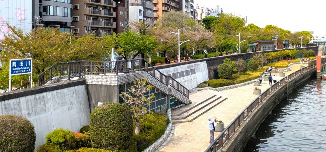 都内の桜はほとんど葉桜となりつつある今日この頃、外出しないともったいない暖かいお散歩日和が続いていますね。「そうだ、きょうはずっと前から渡ってみたかったあの橋まで行ってみよ~っとっ!」というわけで、とりあえず浅草を目指しました。日本中で一、二を争うのではなかろうかという外国人観光客の多さを思うと、浅草に行きたいとはあまり思わないのだけれど、その橋は隅田川に架かっているので、どっちから渡るかだけで、どうしても観光客ひときわ多めの浅草駅周辺は通らないわけにはいきません。それなら、浅草側からすぐ橋を目指してしまえというわけで、東武浅草駅前でバスを降り、川沿いの墨田公園へ。案の定、見渡す限りの信号待ちなどの人の群れは半分以上、外国人観光客で、人力車に乗ったご夫婦やらレンタル着物をきているらしき楽し気な若い女性グループなどあちこちに。公園エリアに入ると、それほど混雑感がなくなって一安心。八重咲の桜がまだ咲いています。(消しゴムマジックで写り込んだ人を消してます。)丁度、電車が走っていますが、そう!今日はあのすみだリバーウォーク(2020年6月開通)を歩くのが目的です。橋に入ってすぐ、「恋人の聖地」!あにゃ、韓国ドラマみたい~。歩行者専用(7時から22時まで開門、通行料無料)ですが、自転車も押して歩けばOK。橋はウッドデッキ、台東区側からだと左横上に東武スカイツリーの線路があって、すぐ間近に走る電車を感じられ、かなりの揺れも体感できます。橋の真ん中辺で吾妻橋を望む。途中下を覗けるガラスの小窓があるけど、暗いからなのか?汚れているからなのか?よく見えない(私の目が悪い?)のが残念にゃり。全長160mくらいらしいので、あっという間にわたり切ります。墨田区側は源森川水門が右手に見えて終わり。この先は隅田川の支流北十間川(昔の名前は源森川)沿いに線路が続き、すぐあるのが「枕橋」でした。実はこの小さい橋も古典落語「文七元結」などにも登場するので、一度渡ってみたいと思っていました。支流沿いの東武スカイツリーラインの線路下は東京ミズマチという名称のエリアができていて、スカイツリー近くまで飲食店などが立ち並んでいるようです。私は空いているゆえ反対側の川沿いを源森橋、小梅橋までブ~ラブラ。その後、浅草通りに出て、味吟で助六寿司を買って帰りました。今日は二つ制覇して大満足だけど、一度渡ってみたいと思っている橋、まだあるのよねぇ。橋(怖くて渡れない手すりの無い一本橋を除く)って、何故か好き♪。