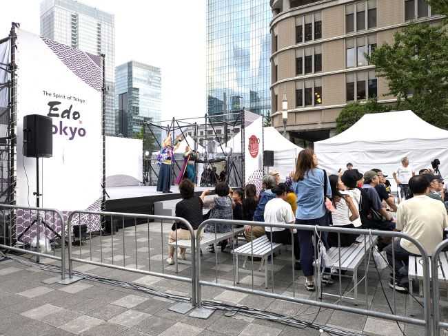 いつまでも続く連日の猛暑に辟易しながらも、エアコンインドア暮らしに慣れてさえきたようなこの頃でしたが、もしかしてようやく秋が近づいた?と思える程度に多少気温がさがった今日、久しぶりに丸の内散歩へ。夕方5時を過ぎていますが、まだ明るくて、時折吹く風に秋を感じます。スマホのニュースで知っていましたが、9月12日~14日まで行幸通りで「TOKYOわっしょい」というイベント開催中なので、見に行ってみることに。人の数はそれほどでもない駅前の広場から行幸通りに向かうと音楽が聞こえてきました。もう舞台でパフォーマンスがはじまっているみたい。人垣を横目に歩道を皇居方面に行って駅側を写してみた。(盆踊り櫓もできてます。)皇居側はもう街灯が点灯していて、なんだか燈籠みたい。参加グループのパフォーマンスを楽しむほかに、法被をきてお神輿と記念撮影するコーナー籠乗り体験コーナーも。勿論、座れる観客席も立ち見スペースもすでに満席で入れませんでしたし、柵前は幾重にも人垣ができていて、思うようにはみられませんでしたけどね。たまたま横側の二列目があいて、写せたのがこちら。プログラムによれば、17時からのよさこい鳴子踊りのようです。土曜日ですから人混みを予想していましたが、思ったほどではありませんでした。人の流れがスムーズになるよう動線がきちんとできていて、随所に配置された整理員が、入場制限やら、誘導などをしているため、混雑感はなくイベントを体験できるようです。暑さに負けて、今年は地元のお祭りも見に行かなかったから、ちょっとだけお祭り気分を味わえて、満足、満足の久しぶりの丸の内散歩、終了。そろそろ、動き出さないとね。※TOKYOわっしょい公式サイトhttps://tokyo-wasshoi.jp/