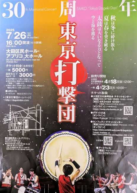 二年ぶりに生和太鼓に酔いしれてきました。和太鼓好きゆえに近所の文化センターホールでの東京打撃団ライブお知らせのポスターを見て心惹かれ、はじめて見に行ったのが二年前でした。なにしろ最前列のチケットを購入したので、迫力たるやそれはそれは圧巻でした。今年も最前列がとれました。16時開演、15分の休憩をはさんだ二部制でそれぞれ6曲ずつのプログラムはすべてオリジナルのようです。篠笛の二重奏など静かな曲も間に入って、変化のあるプログラムになっています。メンバーは8人だけで、太鼓の並び替えもメンバーだけで行い、曲がとぎれる感がなく自然な流れで続くのがいいですね。ほんの少し休んで、すぐまた次の曲も続けて演奏という人もいるわけで、さぞかし若いエネルギーが必須なことでしょうね。演奏曲目の書かれたプログラムがわたされるので、紹介アナウンスがなくてもわかりやすいです。それにしても、なんと息の合った舞台だこと。8人のメンバーは揃いの衣装をまとっていても、ヘアスタイルがそれぞれ個性的です。なんだかみんなキャラも違いそうで、人の顔を覚えにくい私でさえ(二回目だったこともありますけど)、ほどなく個々を識別できるようになりました。ラストのメンバー紹介のあと観客のアンコール手拍子に応えてのパフォーマンスもあって、幕が下りたのは17時50分くらいでした。技もさることながら、力強く、若さあふれる舞台で、エネルギー残り少ない我が身にも元気を戴けて今回もおおいに魅了されました。東京打撃団は世界各国でも公演されているようで、今年は結成30周年だとか。7月には大田区で公演されるそうです。益々のご活躍を祈ります。※東京打撃団HPhttp://www.dagekidan.com/info/