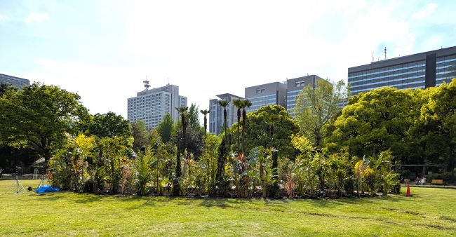 毎年、時期になるとテレビで一面のブルーの景色が紹介されて、ずっと前から一度行ってみたいと思っているひたち海浜公園ではありますが、ちょこっとネモフィラを見にいくにはちと遠方が過ぎるし、見物人の多さを思うと気持ちが萎えまする。まっ、それも負け惜しみと言えますがね。都内の午後の数時間散歩で見に行けそうな場所にネモフィラはないのかしら?って思っていたら、日比谷公園にもありという情報をゲットして出かけて行ったのが4月22日でした。ネット情報に寄れば日比谷公園のネモフィラの見頃は3月下旬~4月中旬とあったので、すでに盛りが過ぎていたようで、ブルー具合に今一つ物足りなさを感じたものの、木々の緑の中に思ったよりはネモフィラの面積が広がっていて平日ゆえか人がそれほど多くなく、ゆったり癒され気分を味わえました。4月25日から始まるアートイベントの準備中で、第一花壇の中央に小さい森のようなものができつつあり、草地広場には巨人が横たわっているようにゃ。巨人を横から写してみました。心字池には大きな青い手が浮かんでいました。いよいよブルーの景色が見えてきました。ネモフィラのブルーがひろがっているのは松本楼に近い第二花壇あたりです。つつじとチューリップとネモフィラのスリーコラボ。来年もここでネモフィラが観られるなら、もっと真っ盛りにこなきゃね。日比谷公園は、開園130周年を迎える2033年完了予定でエリアごとに再生整備が進んでいるようで、今は噴水広場が閉鎖中でした。その囲いがとってもステキでした。遠くから見た時、写真かと思っていたら、本物の草花が植えられていて、思わず近寄って1ピースを写してしまった。本日は天気にも恵まれ、みのりある楽しいお散歩となりました。感謝。※日比谷公園https://www.tokyo-park.or.jp/park/hibiya/index.html※日比谷アートパークイベント2025https://www.tokyo-park.or.jp/special/2025art_hibiyapark/