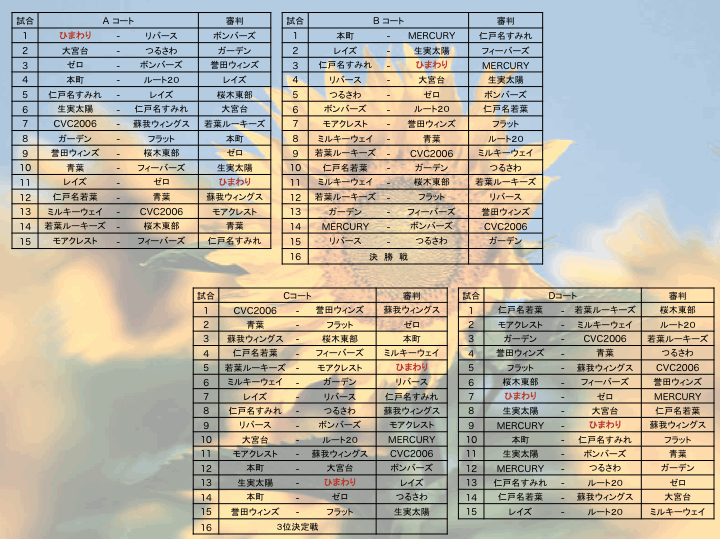 期 日 平成24年4月15日(日) 午前8時45分 ~場 所 古市場体育館参加チーム 生浜フレンズGTO生実太陽A生実太陽BスクランブルF・midoriボンバーズグローリーひまわりFINEPALSLays 以上11チーム幹 事 生浜フレンズ・GTO 1.時間 チーム集合 午前8時45分 開 会 式 午前9時00分 試 合 開 始 午前9時15分 閉 会 式 午後4時30分(予定)2.試合要領(1)ルール『千葉市家庭バレーボール規則』に準じる。(2)試合方法1セットマッチ・20分時間制リーグ戦を行い、各ブロック1位、2位同士による優勝決定戦、3位決定戦を行う。(3)審判は各チームで分担し、その試合の全て(主審・副審・得点・時計)を担当する。但し、優勝決定トーナメント時は、各ブロック2位以下のチームで行う。(4)リーグ戦で成績が同率の時は『得失点差によって決定』とする。(5)組み合わせは、当日抽選にて決定する。3.その他(1)大会参加費 1チーム500円です。(2)抽選で『A』を引いたチームは、開会式で『選手宣誓』をお願いします。(3)会場の駐車場スペースには限りがあるため、各チーム2台での来場をお願いします。(4)体育館の利用に際しては、各自、利用心得を遵守してください。当番 よっしぃ・よっちゃん集金 10・13日送迎 よっしぃ・ちゅん黒黄・黄色ユニフォーム(両方用意)楽しみましょ