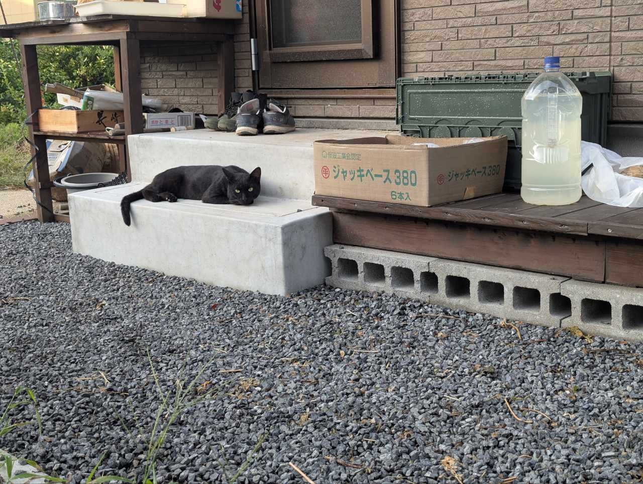 縁側に猫のエサを置いていると、今度は黒猫が登場しました。この黒猫も品が良く野良猫のように思えません。腹の白い茶トラと同じように賢い猫だと思います。ちなみに白い腹の茶トラは居心地が良さそうで、私、夫、母の3人の様子を伺っています。大丈夫な人間なのか面接されている気がします。眼を閉じていますので安心しているのでしょうね。他にも猫が訪問していますが、今のところ猫同士の喧嘩はないようです。追記:黒猫のスピリチャルの意味があるようです。魔除けや商売繁盛をもたらすラッキーキャットのようです。また、本日は己巳(つちのとみ)の日で金運、芸術、学問に強い日のようです。60日に1度の開運日。この日に現れてくれた黒猫に感謝です。