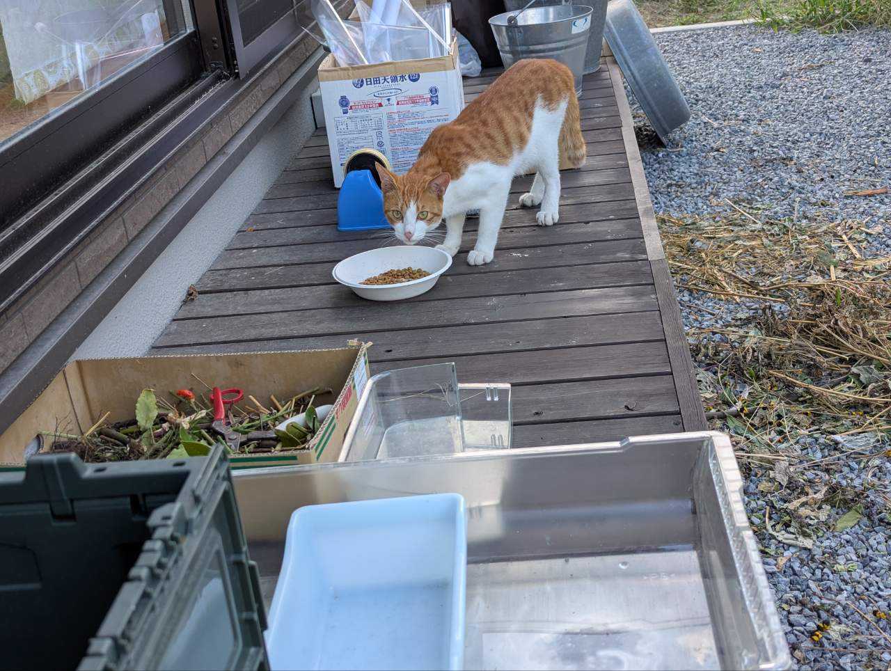 いつも野良猫の茶トラが農地に訪問していますが、今日はお友達を連れてきました。写真に写っているのはお友達の猫です。常連の茶トラの猫は警戒心が強く、遠くに離れていますので撮影ができませんでした。農業と動物は相性がいいのか、自然に親しみたいのは動物もいっしょですね。