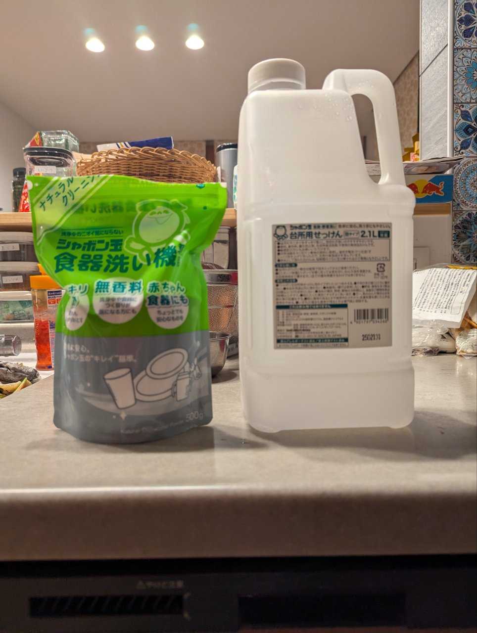食洗機 洗剤 シャボン玉食器洗い機専用 500g シャボン玉石けん 食器洗い機 食洗機 専用 油汚れ 無香料 スッキリ洗浄 消臭効果 環境にやさしい 赤ちゃん食器アパートで使っていた食洗機専用の洗剤です。シャボン玉石鹸にこだわっているのは、健康被害の少ない物を選んでいるからです。安心安全を求めています。新築に変わってシステムキッチンに食洗機が内蔵された物にしました。しかし、食洗機に食器を入れるのにもかなり神経も使いますし、洗い残しもあるものですから基本に戻って手洗いすることにしたのです。夫婦2人で食器も少ないので手洗いで十分であることに気付きました。食洗機を使わないことで電気代も安くなりますので、手洗いにしたのです。乾燥機まで使うと電気代がかなり高くなりますので、食洗機は不要だと思っています。そこで食洗機用洗剤の在庫がまだたくさんありますので、これを知人に差し上げようと思っていましたが、それぞれ好みもありますので自家消費することにしました。粉の洗剤を液体にするために、沸騰のお湯2Lに粉洗剤4g入れて溶かすことにしました。洗い桶に洗剤と沸騰した湯を入れてスプーンで混ぜて溶かしました。冷めたら、液体用洗剤の容器に移す予定です。水切りは流し台の上に網の物が予め設置されていましたのでそれを活用中です。あとは大きなザルをキッチンに据え置いていますので、この2か所で足ります。