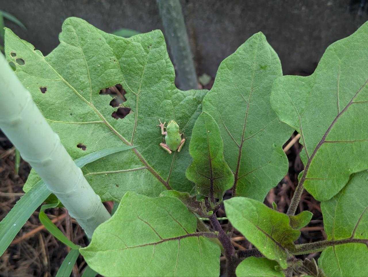 種から育てたナスの苗ですが、葉を虫に食われてボロボロでした。諦めずに植えこみましたが、毎日酢を100倍に希釈して水撒きをしているおかげか、葉が増えましたので最初のボロボロの下の葉を取り除き元気に育っています。納豆菌も水撒きしています。ナスは多くの水分が必要なので、昨日の大雨が効いたかもしれません。しっかりと葉が厚く育っているためか、アマガエルが気持ちよさそうに佇んでいます。約180円のビワの苗を購入して2年3か月が過ぎました。新芽も多く出て成長し続けています。これは納豆菌だけ毎日水撒きしています。唐辛子の植物です。緑から赤に変化する唐辛子を見て観察しています。