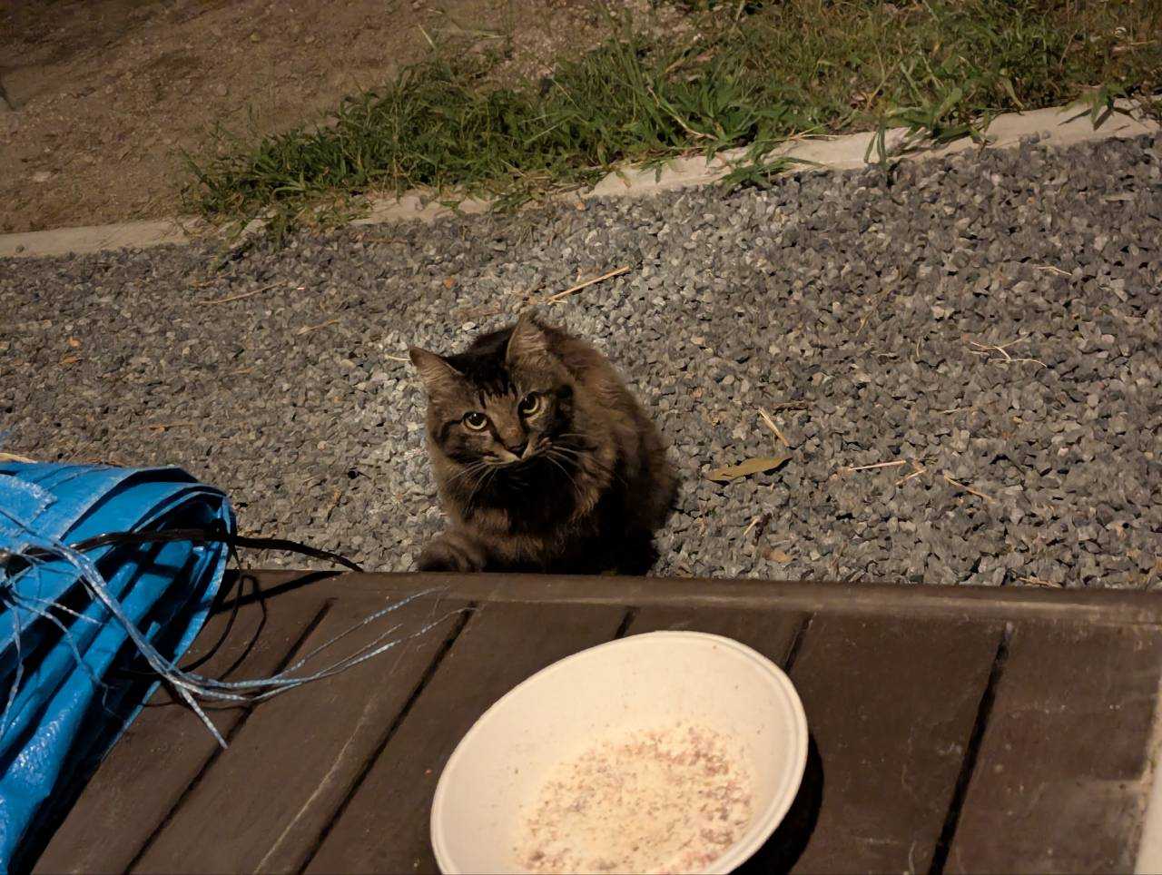今度はこげ茶系統の猫が登場しました。ふさふさの毛で飼い猫だったのか分かりませんが太っています。すぐに逃げることもないので恐らく飼われた猫だったのでしょう。いろいろな猫が訪問しています。
