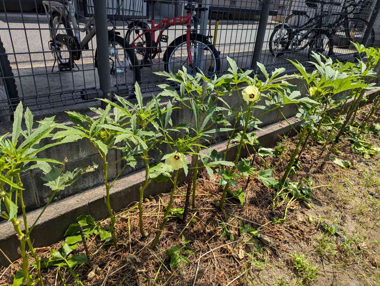 オクラの花がやっと自転車置き場から見える位置まで成長しました。オクラの下の葉は虫食いや枯れていましたので取り除きました。これで栄養分がオクラに行き届くようになるでしょう。まだまだ成長するオクラですが、どこまで伸びるか楽しみに待っています。来年は葉を虫食いにやられない様に酢を100倍に希釈して水撒きをしてみたいと思います。害虫との闘いの農業ですが、無農薬、化学肥料無しにこだわっていますので妥協せずに実験中です。健康体操を指導するより、食事による農薬被害の不健康を是正するのが先決だと思っています。マルチは敷いていませんので、枯れ草等を敷き詰めて水分がなるべく蒸発しない様に厚めにしています。ちなみに薄めの枯れ草を敷いていたところのトマトが枯れてしまいました。豪雨ではキュウリが枯れてしまいました。豪雨が続くと野菜は腐ってしまうことが分かりました。適度に降雨と晴天を繰り返して欲しい所ですが、なかなか難しいものですね。