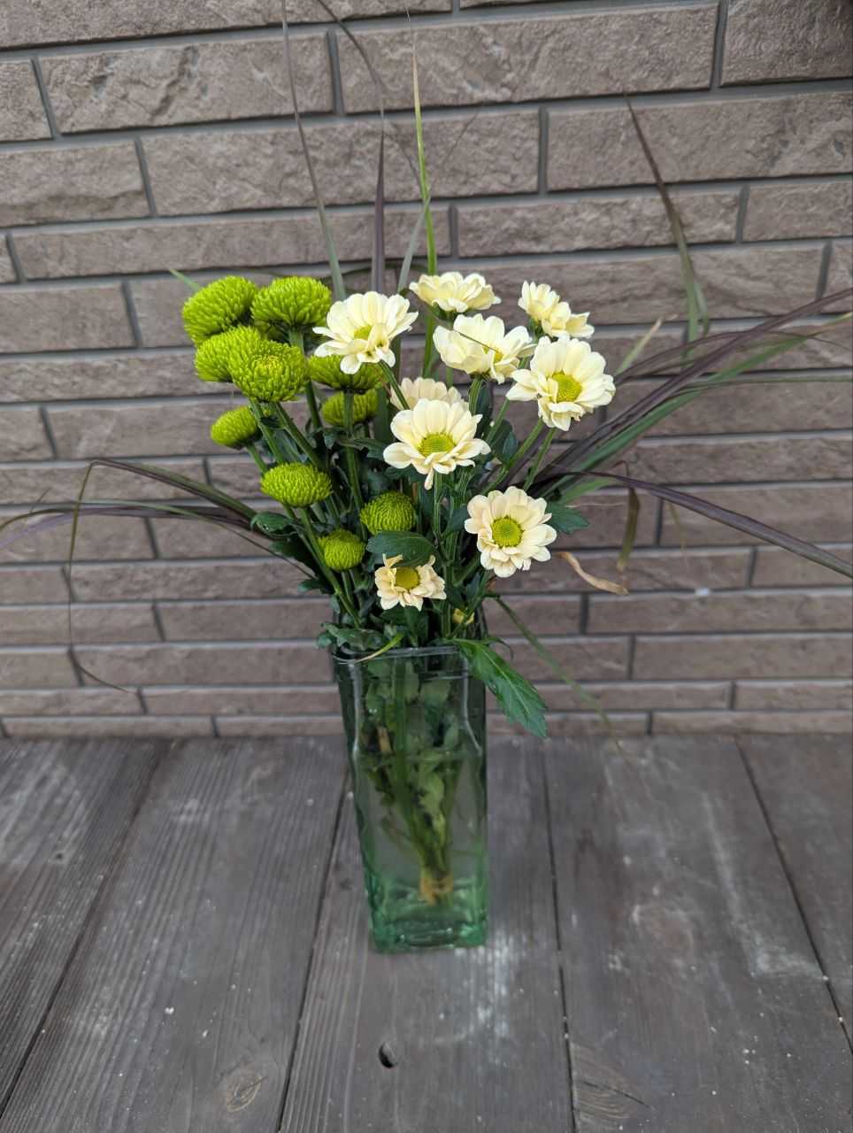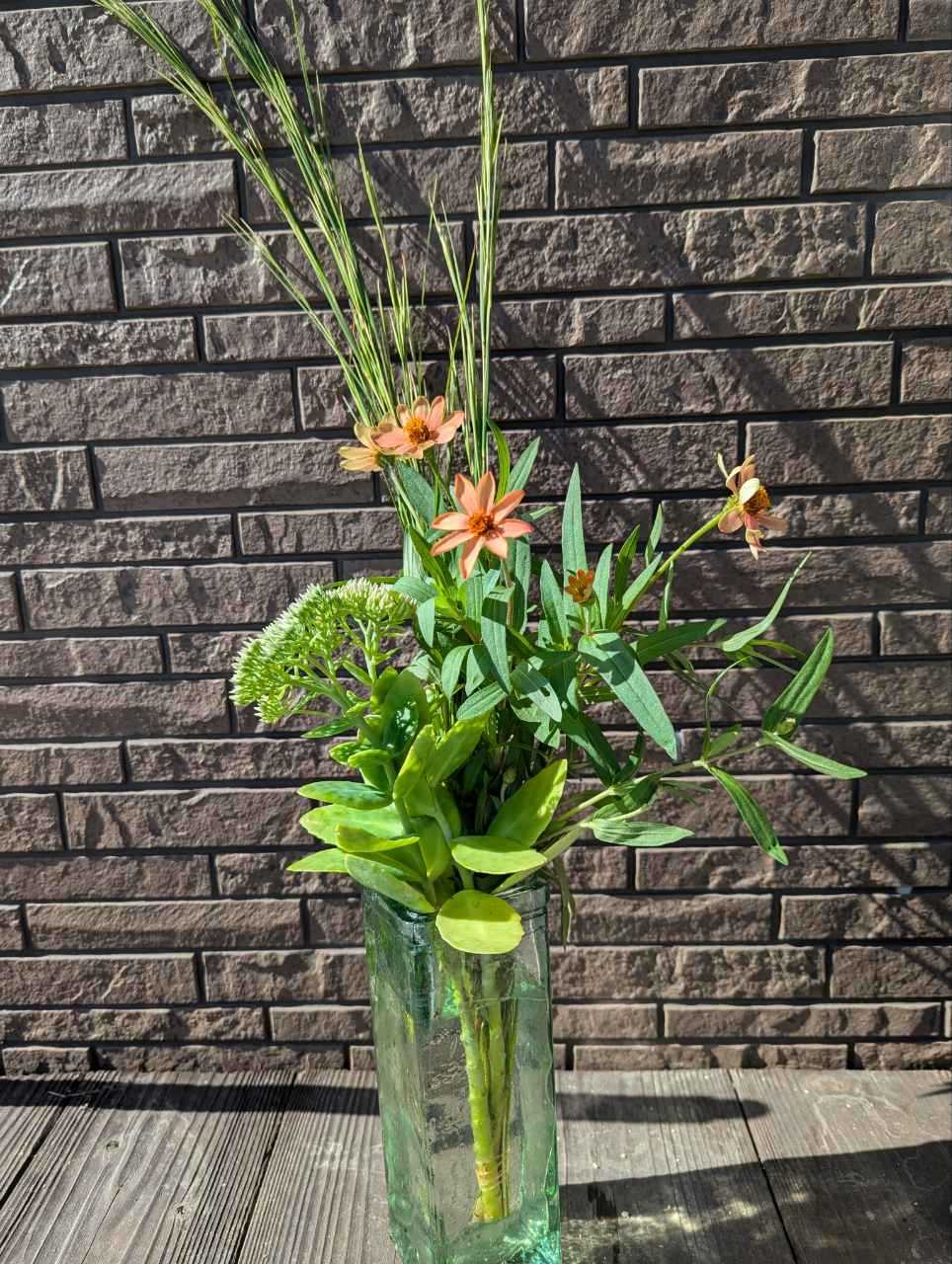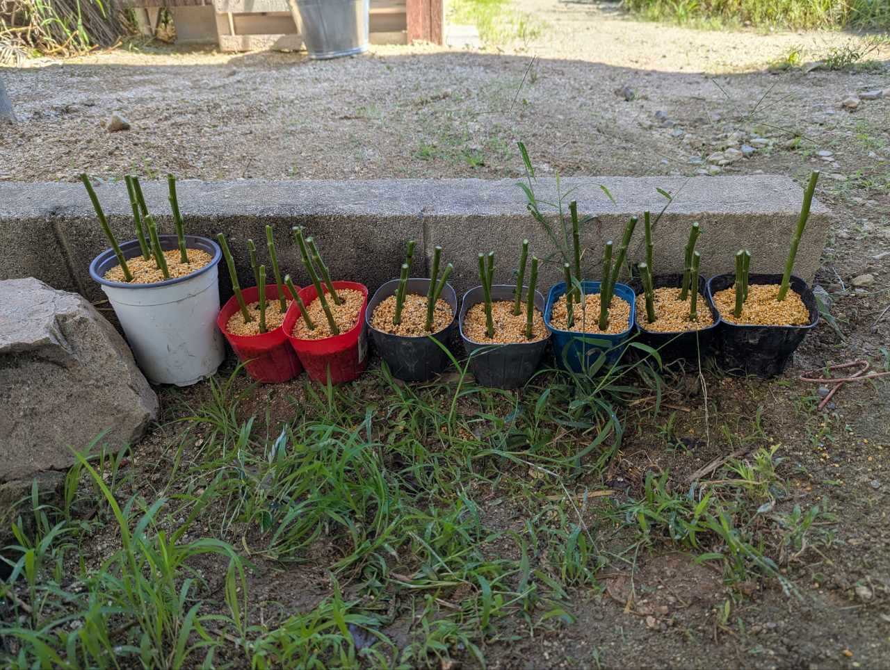 スプレー菊の盗難に遭った切花は写真撮影をしていませんでしたので、再度スプレー菊を購入して記録に取ることにしました。しかし、アレンジするにも実家の山野草がほとんど無くなったため、スプレー菊と背景にあるイネ科の植物のみのアレンジとなりました。パープルファウンティンググラスはイネ科の植物ですが、とても重宝しています。これを産直市場の場長が草と判断しなければ良いのですが。。。盗難被害に遭った時のアレンジで使ったパープルファンテヒンググラスはもっと茂っていましたので、とても良い作品になっていたと思います。それを再現したかったのですが、なかなか材料が揃わないものですから、妥協点としてこのアレンジとなったのが本音です。前回挿し木をしたものが芽吹いてくれました♪初めての挑戦なのですが一安心。正直、葉をつけていない茎だけの挿し木だったので心配でした。まだ芽吹いていないものもありますが、100%成功することはないと思っていますので、できれば50%芽吹くことを期待しています。