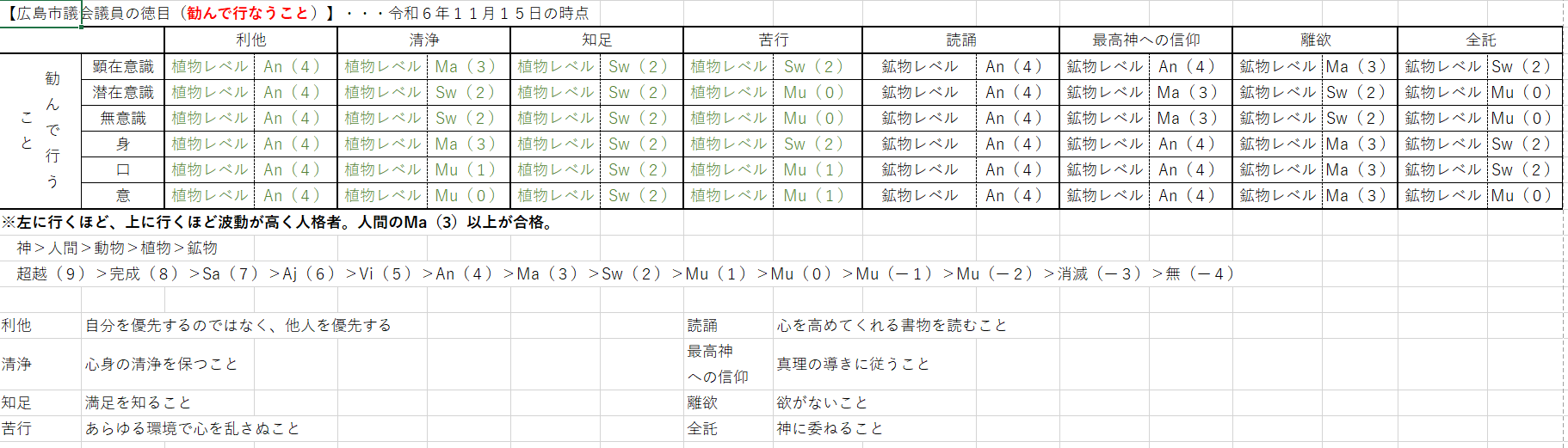 私の新築を紹介した詐欺師の広島市議会議員の道徳の成績表を掲載します。これは以下のサイトを見て作成しました。教育プログラム5これは誰でも確認できます。自分と関わる人物を判定するのに役立ちます。関わると幸福になり発展する人物なのか、巻き込まれ不幸になり衰退する人物なのか。団体の長になる人を調べておく方が無難です。特に政治家は俳優のように良い人を演じ有権者を裏切るタイプが多いので、騙されない様に人物を見極める必要があります。これを知っておくと自分の身を守ることが出来ます。詐欺師の広島市議会議員の道徳の成績表は最悪の結果です。まるで暴力団です。これが中身の実態です。神>人間>相物>植物>鉱物 一番下の鉱物レベルがほとんどです。この詐欺師の議員と関わった設計士は、議員と付き合ってから不幸になりました。この議員と付き合う前の設計士は人物的に誠実でした。先代の出雲大社広島分祠長(神の声が降りる)が良い人だと勧められていたのです。それが議員を付き合い始めてどんどん波動を落として笑顔が無くなり雑談も出来なくなっていきました。建築士1級を取得しても、私が広島市に設計士のことを報告することにより、設計士の悪評が立つに至ったのです。広島市の設計の仕事に悪影響を及ぼすことになってしまいました。当然、施主と現場監督もトラブルに巻き込まれて不幸になりました。施主と現場監督は設計士とは今絶縁状態です。この議員の選挙活動に関わっていたスタッフもこの詐欺師の広島市議会議員から皆離れて行ったようですが、深く付き合うと危険人物だと分かったのだと思われます。次期選挙対策のためだと思いますが、この詐欺師の広島市議会議員は選挙スタッフを探されているのか、地域の人、生まれた地元の人との交流を深めて人脈を作ろうとしているのが分かります。これらの人が設計士のように騙され洗脳されて不幸にならなければ良いと思ってみています。私が広島市に詐欺被害を投稿したのですが、その後、広島市議会議員との写真の掲載は見当たりません。お仲間の広島市議会議員もこの詐欺師に見切りをつけたのか、会派を離れています。今のところ詐欺師の広島市議会議員は1人だけの会派になっています。詐欺師は困ったのか、他の自治体の議員の選挙応援の写真を掲載している状況です。広島市議会議員の仲間だったと思われる名前を掲載していますが、写真の掲載はありませんので詐欺情報だと見ています。有権者を騙しても1500万円の報酬は貰い続けたいための行動なのでしょうね。純粋な人のエネルギーを利用して、自分の利益になる人物を探し続けていますね。利用価値がないと思ったら簡単に裏切って、次のエネルギーを利用できる人物を探すというよくある政治家のすることです。詐欺師の犯罪が露呈されて、刑務所に送られるまでこの詐欺は続くのかもしれませんね。こんな人物に1500万円の報酬は無駄な税金の支出だと思います。この1500万円があったら、道路の陥没事故対策のための防災対策に予算を使ってほしいですね。その方が広島市民の安全を守られます。また、議員による詐欺被害が拡大しなくて済みますから。。。