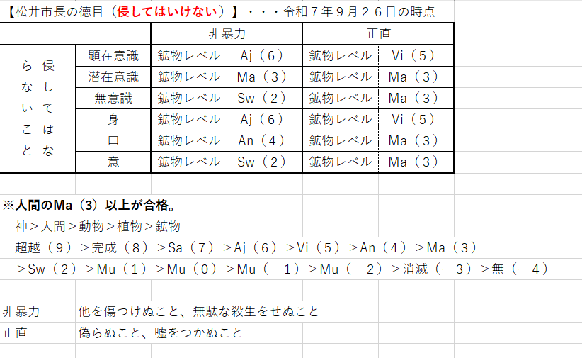 最近、地方自治体の市長の不道徳な事件が報道されていますが、その影響なのか夫が体調不良になっています。私は松井市長が他の自治体の市長の不祥事報道に危機感を感じて、私ではなく夫に対して恨みの念による攻撃を掛けているものと思っています。今までは夫と母と姉が同時に体調不良になっていましたが、この時の恨みの念は詐欺師の広島市議会議員だと思われます。新築の打ち合わせ場所は実家で母と姉が同席していましたから、詐欺師は身内を知っているのです。しかし、最近は夫のみ体調不良となり、母と姉は同じ時間帯に確認すると元気なようです。これであれば広島市の松井市長が夫に対してだけ恨みの念を送っているものと思われます。松井市長は母と姉に会ったことはありませんので、夫にだけ恨みの念を送るということは松井市長だと思っています。そこで松井市長の道徳の成績表を作ることで判定することにしました。非暴力と正直の戒律だけ判定しました。神>人間>動物>植物>鉱物の5つのレベルがありますが、松井市長は非暴力、正直のどちらも最低の鉱物レベルとなりました。非暴力の戒律の成績表は詐欺師の広島市議会議員とほぼ同じレベルでした。だからヘリコプターを出動させる決裁をしたのでしょうね。私の新築を破壊して私を暗殺する計画に乗ったと思っています。松井市長は闇の権力者の操り人形のようにしたといい訳を言ったとしても、こちらとしては共犯だと思っています。闇の権力者に断ることもできたはずです。正直の戒律の成績表は詐欺師の広島市議会議員は植物レベルでしたが、松井市長はその下の鉱物レベルなのです。松井市長は政治家としての歴史が長いだけ、ウソをつき続けてきたのでしょうね。詐欺師の広島市議会議員は政治家になったばかりです。でもこの詐欺師は不動産業の仕事でも詐欺を働いていたと思います。松井市長の後援会の人々はこの成績表を知ったらかなりショックを受けて暫く立ち直れないと思います。洗脳を解くには長い時間が掛かるものですから。私が作った道徳の成績表を実際に自分自身で下のサイトを参考に勉強して判断していただきたいと思います。この表は私の作成した日の道徳の成績表ですので、日にちが変わったら変わる可能性もあると思います。本人が反省し心を入れ替えれば、道徳の成績表はレベルアップすると思います。一番分かりやすいのは、最初に自分自身の道徳の成績表を作ると、その差で判断しやすいと思います。最近は農協とのトラブルに追われていますので、非暴力と正直のレベルしか判定していませんが、時間のある方は徳目の残りの項目、愛と野心、品格、才能、カルマもついでにご自身の判定をされることをオススメします。教育プログラム(1):愛と野心(1)教育プログラム(2):愛と野心(2)教育プログラム(3):品格教育プログラム(4):才能教育プログラム(5):徳目教育プログラム(6):カルマ上記のサイトは会員登録が必要です。(1プログラム:550円)豊富な内容なので格安だと思っています。追記:産直市場の場長には私と母の氏名と連絡先を教えましたが、こちらには場長の氏名を教えてもらっていません。この時点でも場長の態度に疑問を感じています。明日も出荷しますが、農協スタッフに場長の氏名を漢字で記述してもらうつもりです。氏名が分かれば個人が特定しやすいので、この場長の道徳の成績表も作成できると思っています。組織の長になる人についてこの道徳の成績表を作っておくと、信頼できる人物なのか否かが分かりますのでオススメします。口だけの人に騙されなくなりますから。。。
