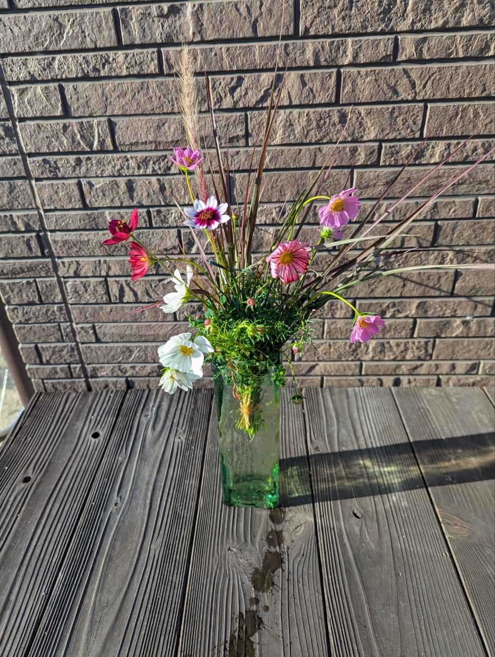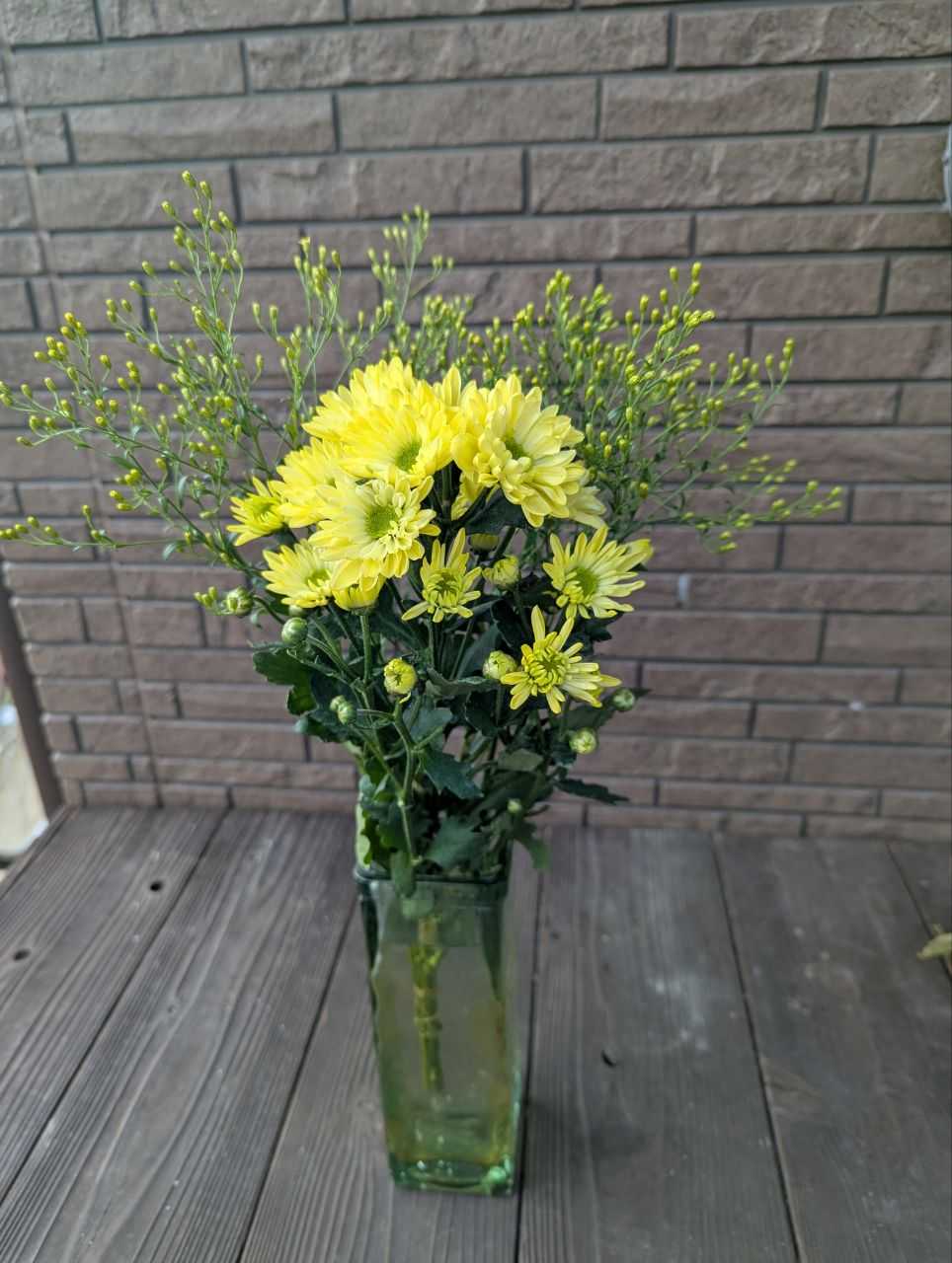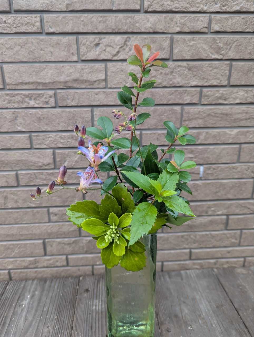 実家と果樹園にある草花を使って切花をアレンジしています。材料を全てバケツに入れてアレンジを考えています。土の組み合わせが良いのかと試行錯誤を繰り返しながら、直感で選んでいます。本当は私好みの草花のアレンジをしたいところですが、切花の出荷は半年余りしか経っていませんので事前準備が足らないところです。数年先には私好みの草花が育つでしょうから、私の好きな材料でアレンジできると期待しています。私は華道を習っていませんの独創性のアレンジになっていますが、これを好まれる方に購入して頂ければという感覚です。