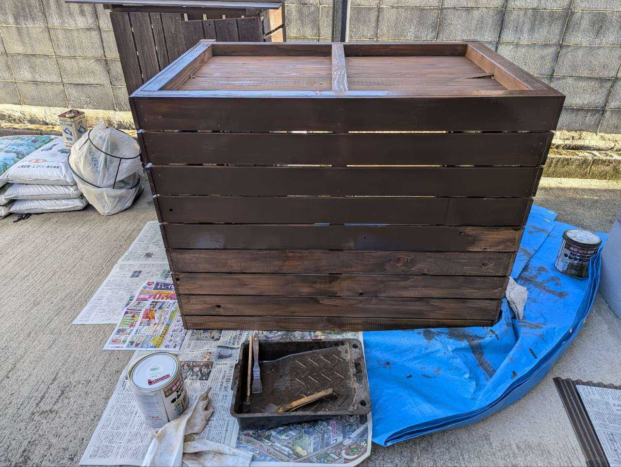 白菜の苗を植え付けました。ポットに植えたかすみ草の種が発芽しましたので、畑に植え付けました。切花のアレンジで使う予定です。バックには最近購入したユーカリの葉を小さくしたバージョンの苗があります。この苗がとても大きく成長することを見込んで、手前には背丈の中ぐらいのかすみ草がちょうど良いと思いました。夕方から大工仕事です。2日前から肥料置き場として使う収納棚の塗装を夜中に行っています。作業場所は新築の土間です。雨天でも塗装が出き、夜中でも電気が付くので効率が良いのです。2日間連続で深夜の塗装です。また過労死寸前まで働かないように気をるけるつもりです。何故急ぐかといえば、実家の個別収集のゴミ箱の隣にこの収納棚を設置して屋根をいっぺんにトタン板を乗せるためにです。個別収集のゴミ箱の申請は大工さんとの施工が済み次第という事もあり、私の作業を予定通り完了しないと大工さんに迷惑がかかりますから。突然湧いて出た話で、予想外の展開で深夜まで作業をしないと間に合わなかったのです。日中は農業。夜は大工仕事。。。今日は土間の外に収納棚を搬出し、外で塗装を行いました。道路際で作業をしていると、散歩人から声を掛けられます。「農業だけでなく、大工仕事もするのですか!」と女性陣から驚かれています。何でもできると思われているようですが、国語は苦手ですとお話ししました。私の作業を飽きずに見られていましたが、女性でもDIYが出来ると思われたようです。明日も仕上げの塗装を行う予定です。ムラのないようにきれいに仕上げたいです。
