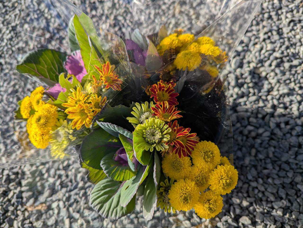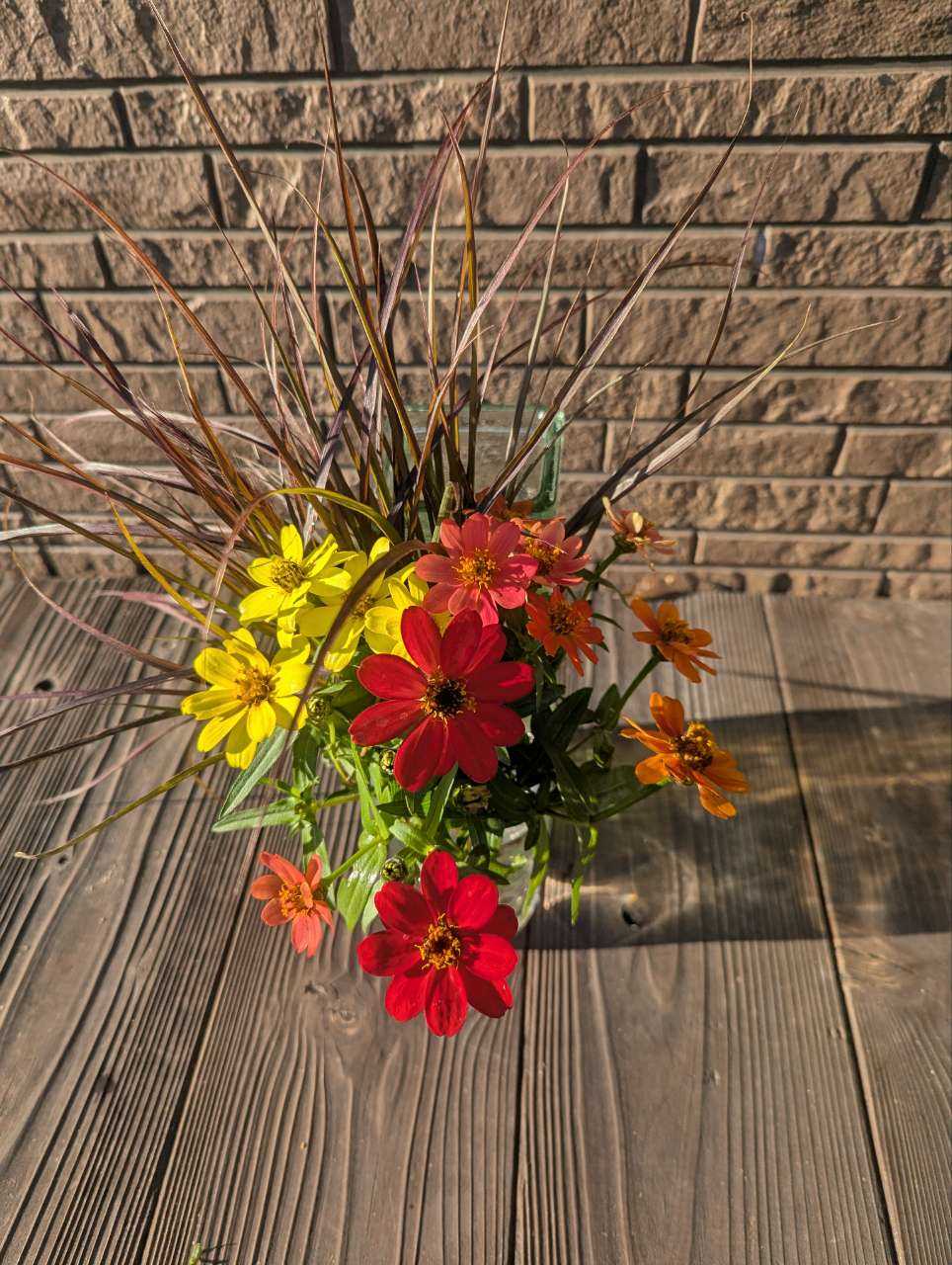 大根菜の出荷を終えて朝食を取った後に切花の出荷をしました。イネ科の植物を一緒にアレンジすると花が引き立ちますね。産直市場の切花コーナーをゆっくり眺めましたが、アレンジがレベルアップしていました。私の作品を見て参考に真似られている気がします。若手が入ると、新鮮なエネルギーが入るのですね。私も他の生産者さんの農産物を見て学んでいますが、他の生産者さんも同様だと思います。この産直市場は生産者さんにとって勉強になる場でもありますね。これを思うと私のような現役世代が増えて欲しい所です。切花をコップに入れて撮影しました。花瓶を出さなくてもコップに入れるだけの切花も気軽で良いですね。この切花を昨日質問を受けた西村ジョイに持って行きました。バックに使っているイネ科の植物を大量買いした理由を説明するために、写真ではなく現物を見て頂いた方が良い気がしました。昨日対応して頂いた従業員さんもいらっしゃいましたので、話がスムーズに出来ました。この切花を差し上げることを言うと、3人の女性従業員さんは大変喜ばれました。レジ前の空き場所に飾ってもいいかもしれませんねとお伝えしました。私としては、売れ行きの悪いこのイネ科の植物の付近にこのアレンジの写真を掲示すると売れ行きがアップするのではないかと思うのです。使用用途が分からずに売れ残り、そのために仕入れを渋る傾向があるのだと思います。そのためか生産者もそのイネ科の植物を生産しないのかもしれません。農業を広めるには産直市場だけでなく、西村ジョイのような園芸用品店も協力が必要であることが分かりました。職員だけの視点ではなかなか気づかないことが多いのかもしれないのでしょうね。こうして消費者の生の声を取り入れることで発展することもあるかもしれません。様々な情報を取り入れて取捨選択して更に発展させることが必要だと思います。トップダウンだけでなく、ボトムアップも取り入れるべきでしょうね。現場を熟知しているパートさんの方が消費者の生の声を聞いているものです。そこにお宝の情報が埋もれていてもったいないと思います。トップは部下の意見を聞き取るとその組織が活性化しそうです。出荷している産直市場は従業員の意見を場長が取り入れたのか、切花コーナーだけでも改善しています。