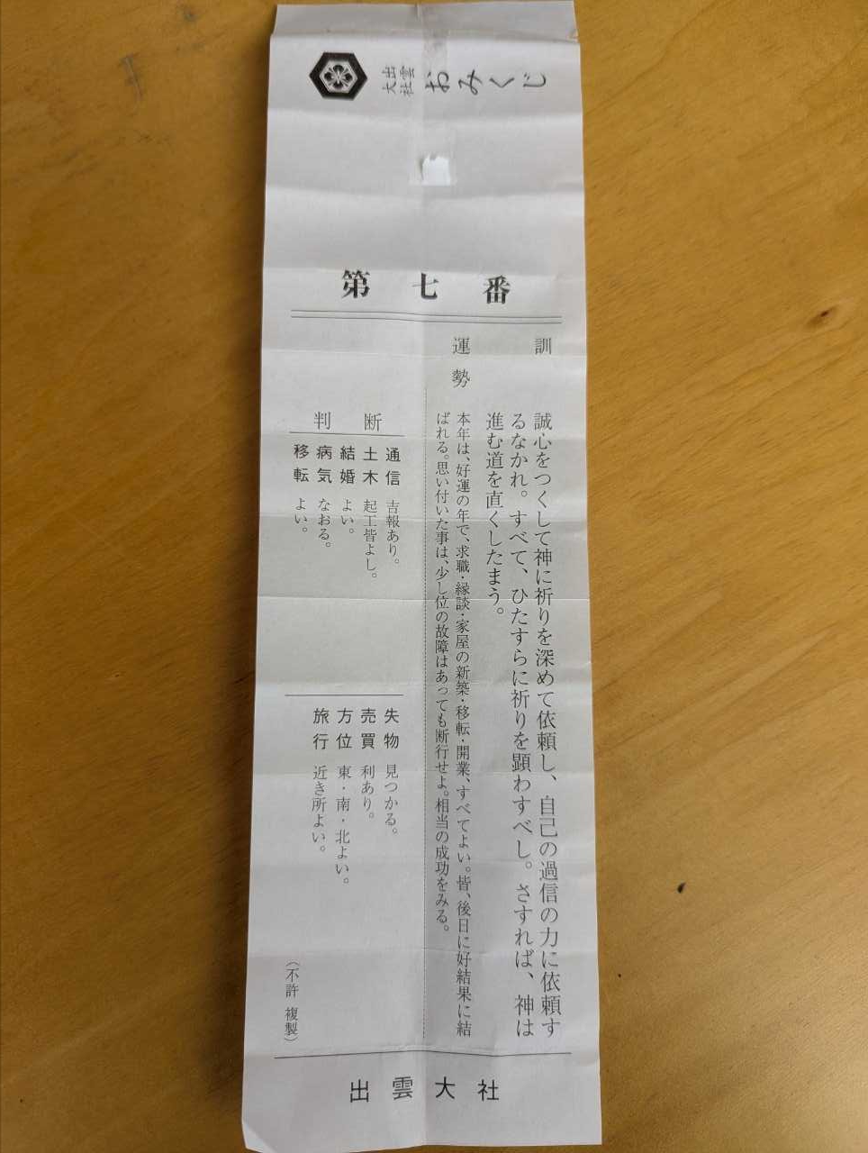 11月22日は「いい夫婦の日」です。私達夫婦は11月21日に結婚式を挙げましたが、翌日が「いい夫婦の日」でした。結婚式の日、新居に入れる家財道具入れ日、入居日、新婚旅行日の日取りはいずれも先代の出雲大社広島分祠長に選んでもらいました。もちろん、夫も分祠長にお墨付きを頂きました。私たち夫婦は身内だけの結婚式と食事会という簡素なものでしたが、結婚式場を借りるのではなく、出雲大社広島分祠で結婚式を挙げました。縁結びの神様である出雲大社で結婚式を挙げられたことも神様に導かれてのことだと思っています。私達夫婦は結婚費用はあまり掛かっていません。結婚式場を借りる膨大な費用を掛けるより、結婚後の生活費に予算を回した方が良いということになりました。新婚の家電製品は偶然なのですが、モデルチェンジ間際で展示品が格安で販売されており、下見で私達は家電量販店に行ったのですが、その日に決着しないと格安で購入できないことが分かり、即決で決めたのです。結婚資金は余りなくても、新婚生活を始めることが出来たのです。これも神様が霊導してくれたものだと思っています。私が精神病院に入院した際、結婚指輪を飲み込んでは危険だという理由で取り上げられましたので、精神病院を退院してから結婚指輪を指に嵌めようとしました。しかし、7年余りの入退院を繰り返した後ですが私は太ってしまい指輪が指に入らなくなりました。無理やり指に嵌め込みましたが、今度は指輪が抜けなくなり大変困りました。何とか抜けてそのまま放置状態でした。夫が退職し少しばかりの退職金がありますので結婚指輪を買う事にしました。以前嵌めていた結婚指輪を下取りしてもらって、好みの指輪を購入する予定です。指輪のサイズには気を付けようと思います。職場の事務室で作業中に指輪が抜けて転がっていったことがあり、探すのに一苦労しました。夫は皿洗いをしている時に指輪が抜け落ちていましたが、夏季と冬季で抜け具合が違うようです。今度はサイズは慎重に選びたいと思います。これは新築の着工から間もなくの時に島根県の出雲大社に工事職人さんの安全祈願のために参拝した時に引いたおみくじです。夫婦ともに同じおみくじを引いたのです。大変驚きました。このおみくじを引いたことで夫婦和合が根本なのだと再認識したのです。夫婦和合の精神が広まれば、戦争はなくなり平和な世の中になるでしょう。夫婦仲の良い子どもはたっぷりと愛情を両親から受け続けるため、精神的に安定しクラスメイトを大切にすることでしょう。いじめやパワハラのない社会になると信じています。