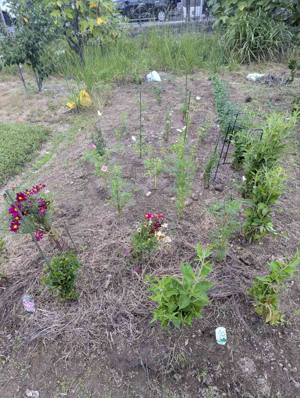 多種類のコスモスと菊の苗を植え込みました。