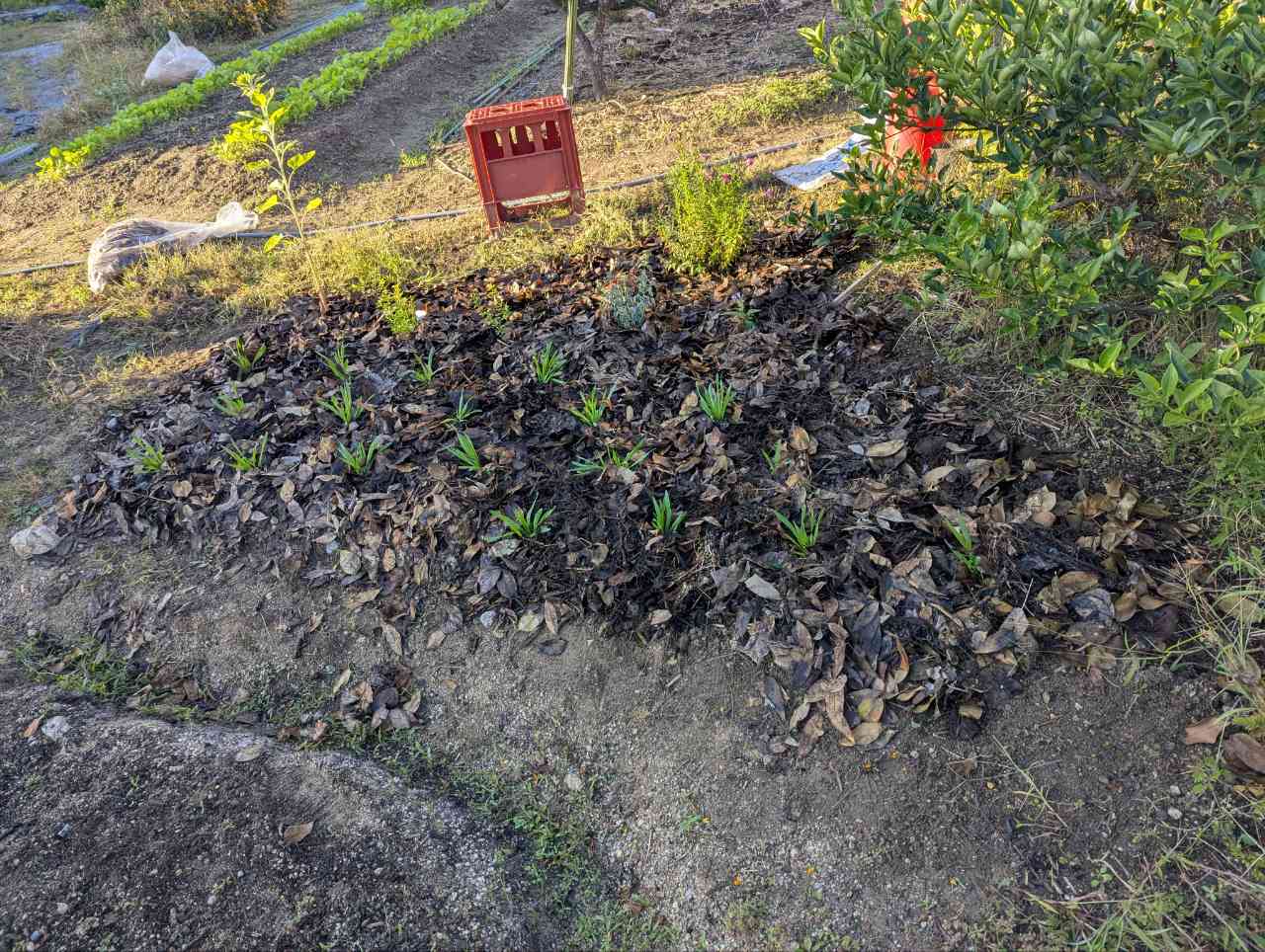 鑑賞麦の苗の付近に発酵した枯れ葉を敷き詰めました。