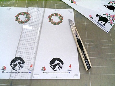自宅でプリントした一筆せんを、カッターでカットしてるとこ。