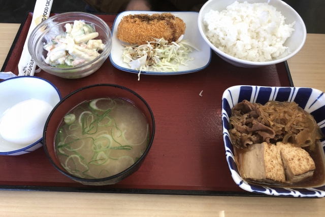 マカロニサラダ、クリームコロッケ、牛すき焼、生卵、お味噌汁、ごはん。