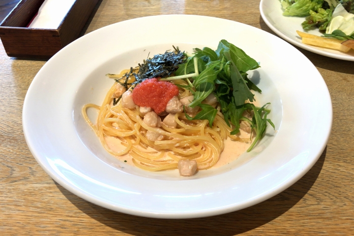 メインのパスタは「小柱と明太子のクリームソース」。