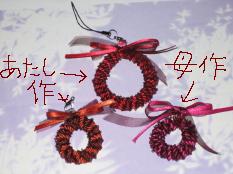 元日に我が家へやってきた あたしの母今回の訪問の目的は もちろん孫達に会うことだけれどもうひとつ・・ リボンレイを作ること!!あたしがお願いして 実家にあったリボンを送ってもらったりストラップの金具を送ってもらったりしていたのでいったいどうやって作るのか??? と 興味津々☆そして あたしの数少ないレパートリーから 教えることに・・母は 洋裁のプロ(今も仕事してます!)で 以前 リボンで飾りを作る仕事をしたことも・・さすが 呑み込みが早い! そして 作るのも早い! あっという間に 一つ・・二つ・・♪その様子を見ていた うちの子供たち当然 「やりたい!!」 といいだしました! ムリムリ!という あたしの意見をよそに 母が教える事 ものの5分・・なんと できちゃった!! 長男にも 次男にも~♪あたしの方がびっくりですよ!\(◎o◎)/!その後我が家は にわかリボンレイ教室 と化すことに・・ 子供たち作→ ←母 作そして 「逆輸入~♪」などと言いながら 母が送ってくれたリボンを ふんだんに使いながら リボンレイを作り倒して 母は昨日 帰ってゆきました~(^_^)/~ これは あたし♪ あたしも 負けてられないよ・・(^_^;) 〈拡大こちら〉