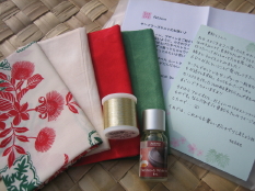 パソコン っていうか 回線? 治りました結局なんだったのか よくわからないんだけどまた普通につながるようになりました 結果オーライ♪ってことで・・ね^^;前回までのコメントのお返事 皆さんのところへのおじゃまは明日からゆっくりさせていただきますね^^ゞ PCお休み中にとっても嬉しいプレゼントが届きました!takaeさんから スタジオK2で選んでくださった キルト用の布と糸 それと アロマオイルもです!!あたしが クリスマスキルトに挑戦してみたいと言ったのでそのために選んでくださったそうです!!オヒアレフアの布が とってもかわいい♪それと ラメの糸 すっごく嬉しいです自分で探していたのですが 見つけられずにいたんですあたしの声が聞こえたのかなぁ・・? これですぐに作り始められます^^それからね アロマオイル♪ 面白いんですよ『バンブー&ホワイトティー』の香り~あたしのイメージで選んでくださったそうです^^本当にホッとするっていうか 落ち着く 癒される香りでふたを閉めようと思いつつ 何度も何度も クンクンかいでしまいます^^;うちのバリグッズの多いお部屋に ぴったりな感じですあたしのイメージにも合ってるといいな♪ 実は クリスマスキルト 本当に頑張ってみようと思って自分なりに モチーフなんか考えてみたりして・・折り紙で切ってみたりして・・・・そんな状態だったので 早速着手!!と思ったのですが もう一つ 一緒に送ってくださった とっても嬉しいものが^^takaeさんがご自身も作られている サンプラーズキルトのパターンです!これもコメントで書いたあたしのつぶやきを受けてくださったもの・・takaeさんのサークルに 参加したい! なんていうわがままを言ったので^^ゞこんな海の向こうに住んでいるのに 嬉しすぎです♪でね! クリスマスキルトに着手する前に練習と思って このサンプラー 作ってみることにしましたちょっとね 色々と失敗を重ねながら 只今こんな状態ですまだ アップリケの1/4くらいですが アハハ・・とりあえず 時間かかってま~す^^;でも とっても楽しいですよ♪ キルト!!(ってまだ アップリケだけどね)パターンは エリザベス・ルートさんの『The Pillows to Patch Quilt Cillection...the Hawaiian Way』より 『Breadfruit』 ですtakaeさん BIG MAHALO~♪ 頑張ってみますね早くPC治って アドバイスお願いしますね!!^^ゞ <追記>そうそう! 皆さんに教えていただこうと思って 書くの忘れた・・キルト芯って 先輩キルターの皆さん どんなのお使いですか?あたし 前回使ったのは 薄かったみたいで プックリ感が足りなかったんですネットで購入するのに おすすめの品 あったらぜひ教えて下さ~い!!