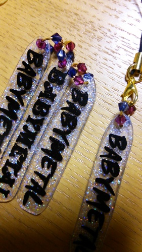 ベビメタストラップとりあえず量産してみようかとロゴ書きおかんのポーチ類半分ほど値付けしてボックスに置いてきたちょっと停滞してたしこれで売れるかなでも明日から雨らしい(>_