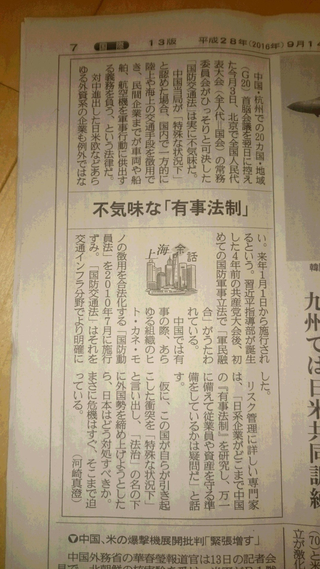皆様こんにちは。週末ごとに子供の運動会や参観日、平日は本番に向けての朝練で、子供は毎朝6時半過ぎに家を出るし、仕事は締め切り前の繁忙期で残業続き・・・と、毎日全力疾走しております。切り干し大根やら、かぼちゃの煮物やら、マリネなどの作り置きおかずは必須。とりあえず、後は肉を焼くか、魚を焼くか・・・で夕食作ってます。何とか半月乗り切った。あとは来週!頑張るぞー!!さて、今日は私も産経新聞を見るまでは知らなかったお話です。中国では、来年の1月1日から、国防動員法に続く危険な法律の成立が迫っております。その周知拡散エントリーです。まずは、9月14日の産経新聞の記事から今までもこのブログで述べてきましたが、中国では「国防動員法」という法律が成立しており、中国共産党が、「有事につき、蜂起せよ」と声をかければ、国内外にいる18歳~70歳までの中国人男女は、国民の義務に基づき、民兵となり、中国共産党の指揮下で軍事行動を起こす。・・・という法律があります。写真の記事を読めばおわかりだと思いますが、来年正月に制定予定の「国防交通法」は自国・他国を問わず、中国共産党が有事と判断した時に民間の船や飛行機などを、中国軍の軍事用として徴用する。というものです。簡単に言えば、中国の空港に着陸したANAやJAL、中国の港に入った三井商船や商社の船、などが、「有事だ」と判断した中国共産党の命令1つで徴用され、日本の尖閣諸島に中国人の民兵を乗せて運んだり、沖縄の空港に中国の民兵を運んだりする・・・というわけです。外見だけ見て、「日本の民間機だから大丈夫」などと思っていたら、えらい目に合います。・・・おそらくその時は、沖縄に潜伏している中国の便衣兵(民間人のふりをした兵隊)らも蜂起しているでしょうから、あっという間にテロ活動が活発化し、大混乱になることは見えています。それでも、沖縄の翁長知事は、知らんぷりを決め込むつもりか?こんな危険な隣国から、続々と留学生がやって来て、国内で失踪している現在、また、尖閣諸島のEFZに毎日のように漁船に見せかけた武装船や海警が来ている現在、我々はどうすればいいのでしょう?日本共産党も、マスコミも知らんふりを決め込んでいます。これをあり得ないことと笑えますか?戦争は、天災と同じく、ある日突然起こるものです。今の「報道しない自由」を謳歌している日本のマスコミが、戦争に至るまでの経緯をきちんと取材すると思いますか?公共放送のNHKですら、まともに報道しない上に、NHKの渋谷のビルは中央電視台(中国共産党の国営放送)が同居しているのです。1985年の天安門事件(中国民主化運動)を、中国共産党の言う通りに、なかったことにして報道しなかったNHKですよ。今もスルーし続けているんですよ。こんなTV局が公共放送だなんて、毎年6,900億円もの受信料や税金を収入として計上しながら、使途を一切開示しない上に、国会招致の際、(元次世代の党)三宅元議員に追及され、NHKにいる外国人職員の人数も答えられないなんてふざけています。私たちの危機管理について、一人一人がしっかりと考えるべき時に来ているのではないでしょうか?