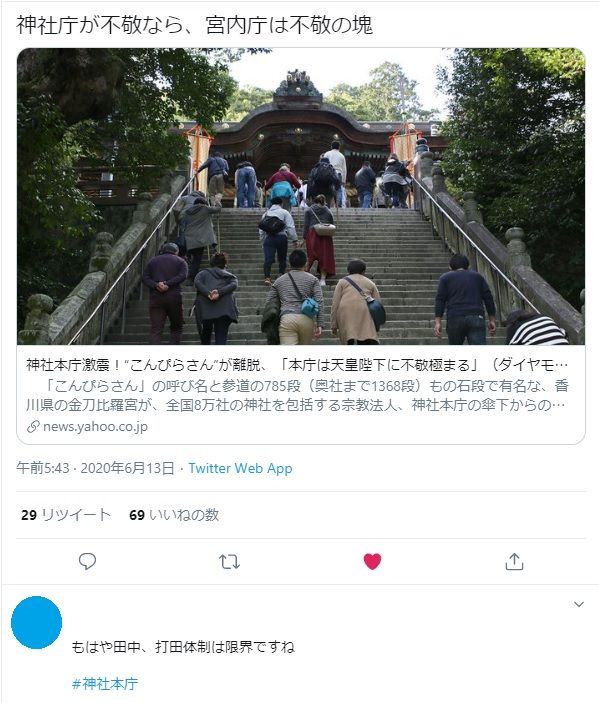 皆様こんにちは。私はどれだけ痛みを伴おうとも、日本の未来を考えるうえで戦後体制との決別をするべきは今だと思っています。コロナで幸いにも日本の隠蔽していた問題が様々明るみになりました。目をそらさずに、逃げずに、向き合いたいと思います。香川県の金毘羅宮がついに動きました。 画像クリックでソース記事にリンクします(ぜひご覧ください。この問題は全国の神社が抱えてます)あなたのご近所の神社も・・・神社本庁が総務省の天下り先!!あれほど中に入る人間は社家(神社)の人間じゃないと受け付けないとしながら神社本庁が総務省官僚の天下り先!!総務省官僚って電通にも天下りしてますし、NHKの偏向報道にも一向にダンマリですよね。かと思えば電波オークションでこんな出来レースをやらかしてます。(2018.8月の記事です)既存のTV局に電波オークションのニーズ聞くってア〇ですか?そんなもん、新規参入を既存のマスコミが賛成するわけないじゃないですか!以前、このブログでも神社本庁の問題は書きました。私達が神社に行くのは年に1.2回程度のことで、神社にお金をおさめるのは初詣のお守りや破魔矢の購入、6月の夏越の祓(茅野輪くぐりの神事のお祓い料)秋の例大祭(秋祭り)への寄付、程度。 あとは七五三、地鎮祭くらいでしょうか・・・。聞いた話では今は「地鎮祭もやらない」「棟あげもしない」新築のお宅もあるのだそうです。節約・・・かもしれませんけど、うーん・・と思います。確かに家を建てるのは大きな出費ですから、少しでも節約したいのは分かります。でも、地鎮祭というのは、家を建てる土地を土地神さまからお借りするという意味で、ご挨拶のようなものです。それを省くって・・・(神様を信じる、信じないは人それぞれですけど・・・。)あ、うちの場合は土地の中に古井戸がありましたが枯れていて使えなかったので、そこも真砂土と、お酒を供えて閉じました。井戸はそういうものの出入口になりますから、きちんとしておかないと怖いです。話は変わりますが、覚えてます?弟が姉の宮司を刺殺した「富丘八幡宮」今の宮司さんはいい方のようですが、中の人から聞いた話では、当時、外国人が絡んでいたようです弟が姉の宮司を刺殺した事件、私が内部の方から聞いた話では、現場近くのコンビニには不自然な証言をする外国人がいたそうです。その方は今回の金刀比羅宮の離脱についてこのようにおっしゃられています。今の(神社)本庁は、各神社の独自性とその独立、固有の祭祀を消し去り、本庁組織の傘下に収容し支配するシステムです。本庁が始められた理念が変容したのではないと思います。本庁から承認を得られないと、各神社は全ての祭祀をはじめ、業務が立ちいかないほど。本庁はこれほどまでに支配団体化しています。これらから離脱したい神社が多くとも、独立して経営していく足場が脆弱です。神社は地元が総氏子であるべきものです。土地と人の台帳にもなってきた、人をまとめる場としても、無くてはならない連絡網でもあります。寺社にはその役目がございます。どうか地元の、また地元ではなくとも総ての神社、寺社を宜しくお願い申し上げます。本庁は上部組織ではなく、総ての神社の下部組織でなくてはなりません。神社本庁の許可がなければお札一枚、お守り一つ、神社が売ることができないというのはどういうことでしょう?まるで反社会勢力のみかじめ料取り立てのようですね。