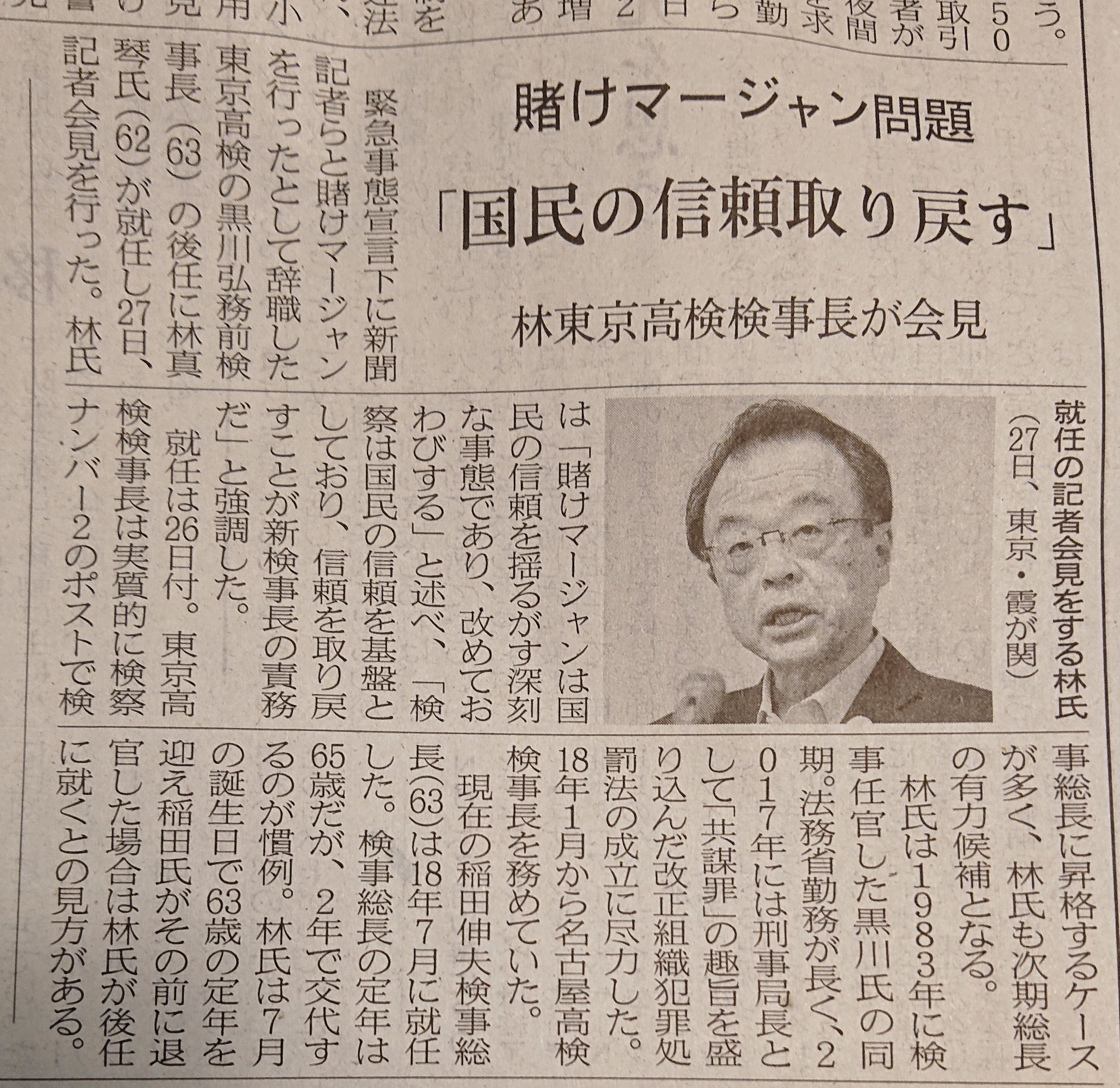 皆様こんにちは。5月末ごろに軽い腱鞘炎を発症してから、症状が一進一退で包丁の持ちすぎなのか、はたまたパソコンの使いすぎなのか右手首のみならず、右腕が肩の付け根から手首にかけてしびれや痛みがあり更新がなかなかできずに申し訳ありません。ネタはありすぎるほどあるんですけどね~・・・。時間がたつにつれ、その時はわからなかったけど今のニュースとつながってくるものもあるのでこれからは小ネタに関しても、記録的な性格を重視でちょろっと書きとめておこうかなと思います。とりとめのない文章になる可能性もありますけどお付き合いいただければ幸いです。m(vv)mさて、朝日新聞、産経新聞の記者と賭け麻雀をした問題で辞任した黒川氏の代わりに就任した林検事長をご紹介しておきます。(日本経済新聞の掲載記事↓)人を見た目で判断してはいけないと言いますが・・・愛知県知事や共産党候補とかと共通点ありそうな雰囲気ですね(うちのばーちゃんはユダヤ人とCKを外見だけで見抜きます)で、朝日新聞系ではありますが、「法と経済のジャーナル」で2018年にこんな記事がありました。簡単に言えば林氏と黒川氏は対照的なタイプだったようですね。 クリックでソースにリンクします上川法相が林刑事局長の次官昇格を拒否か、検事総長人事は?2018/1/18(法と経済のジャーナル様) ちょこっとさわりを抜粋法務省の事務方ナンバー2の林真琴・刑事局長が1月9日付で、名古屋高検検事長に転出した。林氏は、官邸の意向で2度にわたり事務次官昇格が延期されてきた。今回は官邸も容認する方向だったとされるが、上川陽子法相の強い意向で転出が決まった模様だ。次の次の検事総長人事にも微妙な影響を与えそうだ。政府は先月26日の閣議で、名古屋高検検事長に林真琴・法務省刑事局長(司法修習35期)を充てる人事を決めた。名古屋高検検事長は、検察の序列では、検事総長、東京、大阪高検検事長に次ぐナンバー4のポストだ。初めて検事長になるときは、より小さな格下の高検に配されることが多い。林氏の場合は、事務次官を飛び越しての3階級特進だった、といえる。 林氏は法務省刑事局総務課長、官房人事課長など同省の本流を歩み、「法務・検察のプリンス」と目されてきた。法務省としては、次の次の検事総長への就任を射程に入れた人事だったとみられる。(↑私見:・・・ふーん林氏を支持してたのは法務省なのね)(中略)黒川氏は、若いころから独特の捜査センスを持ち、特捜幹部から将来を嘱望されていた。しかし、98年に司法制度改革要員として法務省に吸い上げられ、以後、法案のロビーイングや省内外の危機管理のプロとして今にいたる。 自公政権から民主党政権、さらに自公政権へと政権が交代していく間、法務省審議官、官房長、事務次官と、法務省の政官界ロビーイングの先頭に立ってきた。それゆえ「政権との癒着」「不当な捜査介入」などの批判を受けることもあったが、一方で、実務派の検察幹部やOBらには根強い「黒川待望」論があるのも事実だ。 そういう検察サイドの声は別にして、法務省官房長、事務次官として長く、官邸や政界との窓口を務めた黒川氏に対し、政治の側が親近感を持ち、論功行賞で検事総長にしたいと思っても不思議ではない。(↑私見:黒川さんはどうやら捜査・立件する検察側の支持を集めてたようですね)(詳しくはソースをどうぞ。全文読んだ方が間違いないと思います。)-----------------------そういえば、皆さんもすでにご存知だと思うんですが、辻元清美議員の「大阪のお父ちゃん」だった武氏はじめ、80余名逮捕されていた連帯ユニオンのメンバーがこのコロナ禍下で釈放されているんですよね。マスコミはどこもダンマリですけど、これこそ報じたほうがいいんじゃないかしら??あの時は、検察の女性検察官がマスコミに捜査情報をリークしたり、(そしてなぜかその後 彼女は北海道へ栄転しているんですよね)司法に潜む闇が垣間見えた事件でした。これで釈放となれば、何か力が働いたのではないかと勘繰りたくもなります。あの時、反社会組織まがいの連帯ユニオンの告発に関わるきっかけを作ったのが、桜井誠さんのいる「日本第一党」の顧問、「瀬戸弘幸さんでしたね。瀬戸さんのブログでその顛末を読んだ記憶があります。せと弘幸BLOG「日本よ何処へ」(2018年1月前後ごろのブログかも??)(↓インタビュー動画などを貼っておきます)・・・で、ちょっとこの記事も気になりました。(↓タイトルクリックで記事にリンクします)黒川前検事長と賭け麻雀した朝日・産経記者3人が匿名で、取材をめぐる議論もなされないのはおかしい(yahooニュース:2020.6.14)これも気になるところをちょっと抜粋↓発売中の月刊『創』7月号でジャーナリストの浅野健一さんが「黒川検事長と記者の賭けマージャンはキシャクラブの産物だ」という記事を書き、その中で、黒川前検事長と賭け麻雀した朝日・産経記者3人の実名を明らかにしている。掲載誌を朝日・産