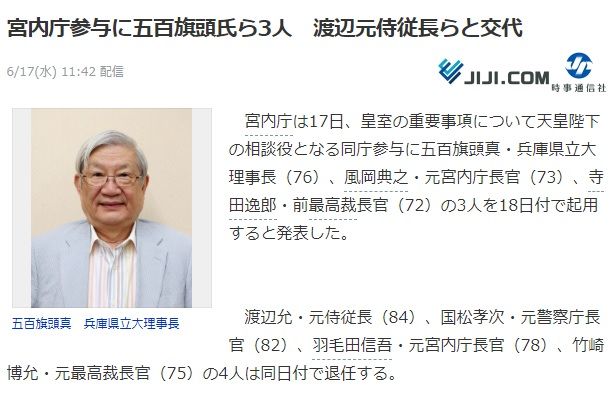 皆様こんにちは。総務省が電通に天下り、神社本庁にも天下りしていたりとか文科省が25年も前に日教組に乗っ取られていたとか財務省は国民を餓死させるために働いているとかまぁ、これでもかと 国家中枢を侵食している外来種や共産党員らが正体を現してきました。後で戻って取り上げますけど、いきなり自己判断でイージスアショアの配備を取りやめた河野防衛大臣もですね。ここまで食い物にされていたとは・・・。さて、そんな中 とんでもない人事が行われました。 (画像クリックでニュース記事にリンクします。)ノーパンしゃぶしゃぶ&創価つながりの羽毛田→風岡で引き継ぐんですね。マスコミは相変わらず、眞子さまの結婚の意思は固いなどと報じていますがそんなことあり得ません。(画像クリックでソースにリンクします)歴代の宮内庁長官ですちなみに現・山本宮内庁長官はコチラ↓※やっぱりこれを仕組んだのも宮内庁とそっち筋ですね。北朝鮮の記念日に裁可の日を入れようとしたり(7/6)裁可が行われたとされた9/3には、早朝に北朝鮮がミサイルを発射し、政府の非常事態宣言の中、裁可を強行しました。今もマスコミはどうしても眞子さまと小室をくっつけたいようですがこの話は最初から火どころか煙も立ってなかった話です。秋篠宮家は、最初NHKのスクープが報じられた時から、一貫して全員が沈黙を貫いています。週刊紙の記事だって宮内庁関係者、職員関係者の話ばっかりで、宮内庁がきちんと発表したのなんて裁可の時くらいでは?それもいわくつきの山本長官ですけどね。私が皇室に疑問を持ち始めたのが2017年の眞子さまとKKの婚約内定問題だったので拙ブログにも眞子さまの婚約に関わる不思議な点を取り上げています ◆ご皇室の疑問(2017.6.9)◆眞子さまとKK・令和の内廷皇族(2019.6.9)平成から令和に関わる譲位の不備や、皇室典範の特例のおかしい例も◆政府と宮内庁グル?・・(2019.7.9)--------------------------------------------------------------------------覚えていらっしゃる方も、多いと思いますが雅子さまはクラミジアによる卵管閉塞で、自然妊娠が望めず、当時の産み分けの第一人者が行った人工授精で生まれたのが愛子さまでした。今、中央官庁の利権や天下りに群がる官僚が次々と明らかになってきていますが(彼らがやってること自体、税金の私物化なので、朝鮮や中国と変わりありません)今回の宮内庁の人事を含め、中に入り込んだ者の狙いは世界唯一である日本の皇室利権とその予算でしょう。政府与党の中の共産主義者(菅官房長官や公明党、自民党内の女系天皇賛成派(甘利さんや河野太郎防衛大臣など)と結託して、国民と皇室を分断し、エチオピアのようにクーデターを起こすのが目的の一つ。それには国民の敬愛を受ける秋篠宮家が邪魔だから小室との縁談で破壊をもくろんでいるのでしょう。勿論、創価学会もね。天皇が創価学会だったらこれ以上の広告塔はないですもんね。それにまんま利用されそうな人のいい徳仁天皇。本来なら、皇室と日本神道を守るのがお役目の宮内庁、神社本庁。しかしその利権を朝鮮や共産主義者、外国人が入り込み、食い荒らしています。もはや皇室は何にも守られず、風前の灯火です。もはや国民が覚醒して声を上げるしか方法はありません。青山繁晴氏の「道すがらエッセイ」も皆さんの一助になるやも知れません。(★2020.6.18:国会の閉じた、その翌朝にて)もう人任せ、政党任せでは、移民も、国内の治安維持も、2680年続く皇統も守れない状態に来ているのです。「普段の生活の延長に政治がある。」これからもこのモットーの下、日々の記録を続けていきたいと思います。いつも遊びに来てくださる皆様、ありがとうございますm(vv)mともに頑張る仲間がいれば、こんなうれしいことはありません。先日、ツイッターで自民党、日本の国益と尊厳を守る会・小野田紀美議員が、「ツイッターやメールで世論の後押しをお願いします。」と仰っていました。一人一人は微力でも、あつまれば、親中親韓の経団連よりも強い声になるかもしれません。官邸メールにもご協力お願いします。見送付先>★(文字クリックでリンクします)★・首相官邸(ご意見)・電子政府e-gov(内閣府&内閣官房と関係省庁宛に)まめはなさん、新しい文例をありがとうございました。早速使わせていただきます。(文例)・韓国と北朝鮮の情勢が不安定ですが、日本に難民が押し寄せてこないようにしっかり日本を護ってください。韓国・北朝鮮の難民、密入国者をこれ以上日本に入れないでください。・宮内庁が、新たな三人の天皇家の相談役を発表した。カトリックで自虐史観の五百旗頭真氏や創価学会信者の風岡典之氏が就任するのはおかしい。旧宮家にもご助力頂き、神道や皇室の伝統に詳しく日本愛し皇室を敬愛する人を選ぶべきだ。・自虐史観で有名な五百旗頭真氏が防衛大学学長を務めるのはおかしい。適切な人選を願いたい。・悠仁さまの日本の近代史を半藤一利氏が家庭教
