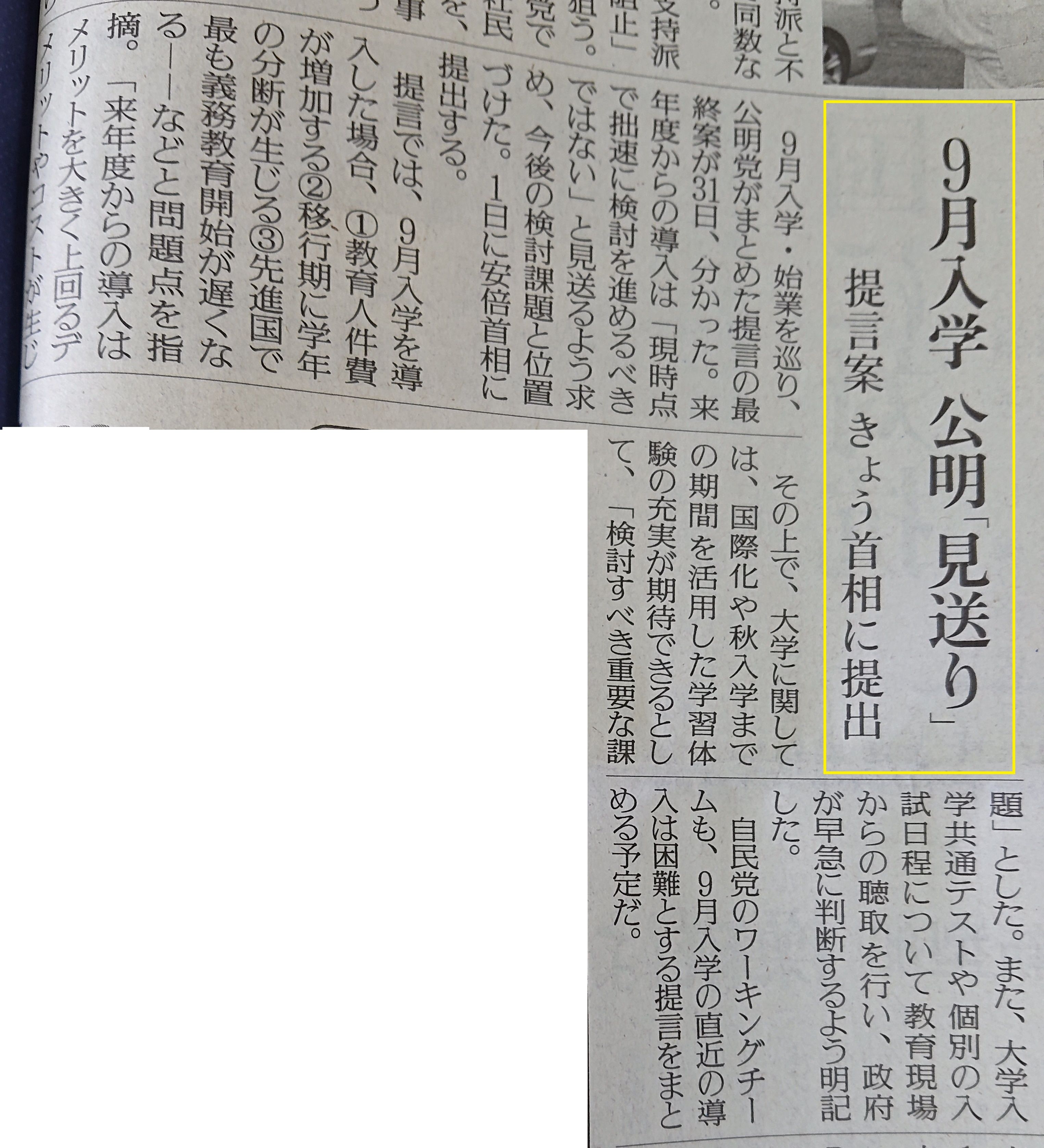 皆様こんにちは。6月1日の新聞で見つけました 先日、自民党の稲田議員や下村前文科大臣が要望書を出した、来年度からの9月入学については、今回はひとまず見送られることになりそうです。でも、決して白紙撤回になったわけではないし、公明党の意見書でも 大学に関しては「検討すべき重要な課題」のまま。このまま油断せずに推移を見守っていきたいです。それにしても。自民党は何をしてるんですかねえ?安倍さん、弱腰すぎます。あまりにも側近の造反が酷い&多すぎるため10万円の給付金の時と同じく、「公明党から意見があったので」・・と理由づけるつもりでしょうか?公明党はどう考えても選挙狙い、有権者へのアピール狙いですよ。真の狙いはこれを恩を売ったふりをして、習近平の国賓招待でしょう。なんたって皇室や外務省の大鳳会からも公明党にGoサインが出ているでしょうからね。・・・と書いたら思いのほか早く出ましたね ほーら、やっぱり。習近平の国賓来日が目的じゃん。国賓で来日になったら、天皇皇后両陛下との公式会談も実現するだろうから皇后の父が泣いて喜ぶね。またとない天皇謝罪のチャンスだもんね。しかも令和の天皇は自分のいいなり。原稿さえ作ったらそのまま読むだろうしね・・・だとしたら、ますます公明党の言うことを聞くわけにはいきませんし、決別するべきです。分かりやすいやり取りを出しておきます ↓大事なことなのでもう一回言います。「政党なんて関係ない」どれ選んでももれなく売国がついてくる。何を選んでももれなく特亜がついてくる。 ヤラセプロレスのようなもん。 ↑これ大事です。きっぱり決断しないと、ますます傷口広げますよ。そもそもですけど、公明党、母体はフランス下院でセクト(カルト)認定されている新興宗教ですよね。公然の秘密ですけど。政教分離に反している政党がなんで大きな顔をして国会にいるのか?立民とかもそうですが、法を犯した国会議員は即失職に値すると思いますけどね?順法精神のない国会議員が立法するって、あり得ないでしょう。今の制度、甘すぎですよ。・・・話を戻します。先述の公明党の意見書にも出ているけれど大学に関しては、9月入学は切り離してでもやりたいっぽいですね。引き続き油断大敵です。東洋大名誉教授のこの方はこんなこと言うてますよ。「4月入学は日本とインドだけ」・・・ってうまいこと騙しますねぇ。とりあえずマイナンバーと国民口座を紐づける話も いきなり降ってわいてきましたしマスコミはまともな仕事をしませんし、これからコロナ禍に隠れて、様々な売国法案を成立させられないようこれからも注意深く見て、声を上げていきましょう。今、国民が声を挙げなければ、大勢賛成したことにされてしまいます。少なくとも敵は、強行突破も視野に入れて動いています。皇室も風前の灯火です。-------------------------私達も声を上げていきましょう。↓↓↓<意見送付先>★(文字クリックでリンクします)★・首相官邸(ご意見)・電子政府e-gov(内閣府&内閣官房と関係省庁宛に)(文例)・一国二制度を破壊し、香港市民の承諾なしに香港を自治下に置こうとしている中国に抗議をしてください。 口先だけで済ませるのは、もうやめてください。 中国は日本も狙っています。沖縄、北海道は実質的には落とされているも同然です。 もちろん、習近平の来日にも反対です。・全人代が香港の国家安全法を成立させました。抗議をしてください。・中国は日本を支配下に置こうとしています。 北海道の土地は随分中国人に買われてしまっています。 外国人が日本の土地を取得するのを法律で禁じてください。 また、既に買われてしまった土地に関しては国が強制収容できるような法律を作ってください。 ・中国には国防動員法があり、他国に帰化した者もそれに従います。 長野オリンピックの中国人の暴動は恐ろしいものでした。 中国発の新型コロナの蔓延により世界から追い詰められた中共が、日本と日本人を人質にする可能性は十分考えられます。 日本の土地を買い漁り、続々と侵入してくる中国人への対策を具体的に講じてください。 (まめはなさん、文例ありがとうございます!) 国内の大企業が次々と中国からの国ぐるみのサイバー攻撃で国防情報等が流出しています。内通者も考えられるため、外国人の雇用は見直すべきではありませんか?政府から経済界に要請のあった9月入学制度に大反対です。また、政府の外交政策も、今までの八方美人、お金ばらまき外交から国益国民を守る方向に転換するべきです。コロナ禍に乗じた9月入学制度に反対です。9月入学にするなら、今年から施行しないと意味がありません。しかも9月にコロナが収束しているという保証もありません。入学制度を変える前に、政府や文科省は、病気やけがで学校に行けない子供、10年来高止まりのままの不登校、いじめで学校に行けない子供にも、進学の希望を与えるべく、オンライン授業やネット授業