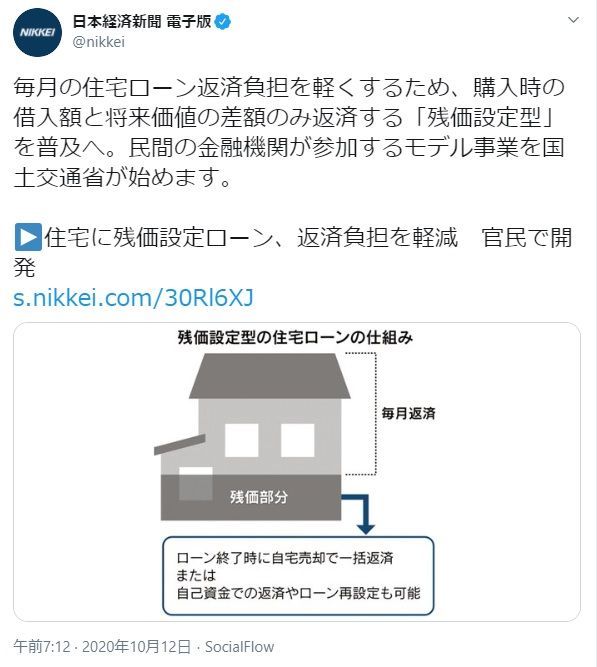 皆様こんにちは。国土交通省がこんな政策を打ち出しました。(↓画像クリックで日経新聞のソース記事にリンクします)<<参考になるご意見がたくさん↓>>◆自動車の残価設定型と同じで「残価」にも金利が発生するでしょ?相当短いスパンで手放さないと爆損だし、そもそもそれなら賃貸でよくないですか?「持ち家」という満足感のためだけに金利を落としてくれそうな情報弱者をターゲットにするのですか??商売としてはアリですね(・∀・)b>>ご指摘通りですね。自動車の残価設定ローンが成り立つのは流動性が高い動産だからであって、不動産に動産と同じ流動性は不可能です。仰る通りド短期でやりくり前提なら賃貸で良いでしょう。これは購買層の拡充ではなく銀行救済ですね。・・一応補足しますが、デメリットばかりでもありません。例えば子育て世帯を対象に3000万35年ローン残クレ60%だと月々8万強程度で住むことができ、同路線価帯の新築賃貸マンションだと倍くらいします。なので21年後に必ず引っ越す前提であれば賃貸より安く住める可能性があります。ただ、「21年後に必ず引っ越す。」と言う条件は意外と厳しく、家自体に愛着も出るでしょうし地域コミュニティーとの繋がりも1から構築し直す必要に迫られるかも知れません。そう言った意味合いで不動産は流動性が低く、買取オプション行使が高いので、結果的に損すると思います。これって、残価時にあと何年残ってるか分からないけど、木造の価値って22年しかないから、残価ローンって物凄い月払が高い気がする…高齢になって、支払い能力がなくなった時に売れば、借金はなくなるけど、住むところなくなる。あと、土地はともかく、上モノ(家)は、年数経つとそもそも価値ないよね。。。賢明なそこのあなた、なんだか胡散臭いと思いましたね??御明察!もう、↑のツイートで皆さんの答えが出ていますけど簡単に説明しますと、3000万で家を新築購入したとしましょう。その家が、21年後の売却価格が500万円と査定されるとすると残りの2500万円をローンで支払う仕組みなんですが・・・2500万円の月割ローンにも、残価設定した500万円にも両方に金利がつきます。さらに21年後、残り500万+金利を払って買い取るか、もしくは家を売却するかという条件がつくわけです。買い取れば自分のものになりますが、売却すれば手元には何も残らない。残るのは21年間の思い出だけ。考えてみてください、21年と言えば、生まれたての子供が大学卒業するまでの年月ですよ。人生80年と考えてその1/4に当たります。結構長いですよ。このシステム、誰が考えたんだか分かりませんが、持家と土地には、固定資産税というものが毎年かかるわけです。家の価値は年数がたつにつれ償却されていくけれど、土地は地価がありますからそうそう変わらない。ということは、そこそこのいい立地(校区がいいとか駅チカ、生活に便利)で、転売できる物件にしなくちゃ売却のメドが立たない。…そうなると、土地代も毎年払う固定資産税もバカにならないと思いますが?自分のものにならない土地建物に毎年かかる税金も自分持ちで利用したいと思う人はいますかねぇ?しかも懸念事項があります。日本は災害大国。地震や台風で家が壊れたら、修繕費は当然自分持ち。家の外壁の塗り直しや老朽化に伴う水回りの修繕などのメンテナンスも自分持ち。そこまでお金をかけて自分のものにならない家を持とうと思うでしょうか?運が悪ければ地震で全壊、半壊という可能性もあります。・・・と思ってたら、なんと国土交通省は現在、書面交付が義務付けられている不動産契約をTV電話や契約書をデジタル化する方針だそうですよ。(2020.10.12:読売or愛媛新聞より)たしかにネットで物件を探す人が増えてるのは事実ですし、便利ですがそこに住もうと思ったら(特に家族がいたら)校区や、交通機関(最寄駅)や、買い物をする場所、日当たりなどの立地を実際に見に行くのは当たり前だと思うんですが、(それくらい注意深く物件を観察するということ)ネットだけで完結する人がいるのかな?それこそ人生最大の大きな買い物に対して、あまりにも杜撰すぎませんか?むかーし、お世話になった建築士さんが「土地は慎重に探すべきですね。特に日当たりは大事で、昼間だけでなく、朝や夕方など時間を変えて見に行ったほうがいいですよ。あと季節によって違いますから、できれば時間を変えて、季節も変えて見られるのがベストですけどね」と言っていましたけど、確かに時間帯を変えて見に行けば、そこに暮らしている人達も見られて、空気を肌で感じられるので大事だと思った記憶があります。物件の周りを自転車や徒歩で回ってみるのも大事。立地はいいけど裏のアパートが地震の時に崩れてきそうなくらい古かったとか、意外な発見があったこともありました。それに、今、都市集中で、過疎化の地方は結構市内中心部に土地が出てきています。これから先、少子化でもっと出てくるでしょ