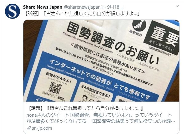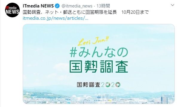 皆様こんにちは。今日はお知らせのエントリーです。昨日10/7(水)は、国勢調査の回答締め切りでしたが新型コロナウイルスなどで回答が遅れた人に配慮して回答期限が延長されました。総務省は10月7日、国勢調査の回答期限を2週間ほど延長すると明らかにした。ネット・郵送ともに20日まで回答を受け付ける。当初の期限は7日だったが、新型コロナウイルスの影響などで回答が遅れた人に配慮する。 国勢調査は、世帯や就業状況の把握などを目的に、日本に住む全員を対象に5年ごとに行っている。対象者は調査票を郵送するか、スマートフォンなどで専用サイトにアクセスして回答できる。6日時点の回答率は、ネットからの回答が35.1%、郵送による回答が18%。総務省のHPでも告知されてます。日本政府が優しくてよかったですねぇ。外国人が入ってきたら、こうはいきません。・回答してない奴は、いないと見なして無視しようぜ。・回答が少ないけど期限だから、このまま進めちゃおうぜ。・・・てなことになりかねません。権利を行使するのも、放棄するのも個人の自由ですが、せっかくの権利を放棄して、万が一の時に文句を言っても、それは「放棄したほうが悪い」となり、聞いてもらえません。当然のことです。特に、若い方や、独身の方こそちゃんと行使していただきたい。日本の未来がかかってる方々ですからね。1億2000万もの人間が住んでいながら、上記の記事によると6日時点での国勢調査回答率は約半分。6000万人しか回答してないことになります。ちなみに、国勢調査は外国人にも調査用紙が配られますからね。日本人の回答率が悪くて、外国人、帰化人の回答率が良ければそちら寄りの政策になることも考えられるのですよ。↓熊谷市の公式HPより見ずらいので転記します。Q:国勢調査はどのような人が調査の対象となるのですか?国勢調査の行われる年の10月1日現在、日本国内にふだん住んでいる全ての人を対象として調査を行います。調査の際には、それぞれの人がふだん住んでいる場所で調査を行います。また、調査する場所は、住民票の届出の有無に関係なく、実際に「ふだん住んでいる」かどうかによって定められます。「ふだん住んでいる」とは、10月1日現在、1.既に3か月以上住んでいる人2.まだ3か月に満たないが、10月1日の前後を通じて 3か月以上にわたって住むことになっている人ということになります。また、国籍に関係なく調査の対象になりますので、1、2に該当する外国人の方も調査の対象となります。つまり、密入国だろうが不法滞在だろうが、外国籍で生活保護を受けていようが、そこに住んでいれば調査の対象になるということです。この重大さがわかってます?・・・・・・・・・・・・・・・・・・・さ、まだの人は早く国勢調査の回答を提出しましょう。高い税金納めているのに、政策から外されるなんて腹が立ちますよね。インターネット回答なら10分ほどで回答できるし、調査員の方の訪問もないから楽ですよ。オンライン回答では、調査票に記載のIDやパスワードが必要ですから配布された国勢調査の封筒をお手元に準備してくださいね。アクセスしやすいように総務省の国勢調査オンラインのリンクを貼っておきます!下の画像クリックでリンクします(同ページに回答のボタンがあります)
