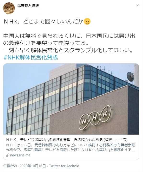 皆様こんにちは。ちょっとエントリーの順番が前後しますけど、自称「公共放送」NHKがこんなことを言い出しました。それぞれの画像クリックでソースにリンクします(上記ソースより要点を抜粋します。※赤字は管理人のツッコミです)NHK、テレビ設置届け出の義務化要望 氏名照会も求める(2020年10月16日 14:01:産経ニュース:)NHKは16日、総務省の有識者会議分科会で、家庭や職場にテレビを設置した際にNHKへの届け出を義務化する放送法改正を要望した。合わせて、NHKとの受信契約を結んでいない世帯の居住者氏名や、転居した際の住所などの個人情報を公的機関などに照会できる制度の導入も求めた。放送法は64条で、NHKの放送を受信できるテレビなどの受信機を設置した人に対し「放送の受信についての契約をしなければならない」と定めている。NHKは現在、未契約者に対して訪問や文書で契約を促しているが、テレビ設置の有無を確認できないケースもあり、訪問をめぐるトラブルも起きている。また、人海戦術に頼るため、多大な人件費もかかっている。(↑委託会社に丸投げです。またその委託会社にも問題が多い)こうした制度ができれば、テレビ設置を届け出ない未契約者について自治体や電気、ガスなどの企業に氏名を照会できるようになる。NHKは照会を通じて未契約者を特定して郵送などで届け出を促す意向だ。それでも応じない場合には「訪問による対応や複数回の通知を行ったうえで最終的には訴訟を提起することも視野に入れる」(松坂専務理事)としている。松坂千尋専務理事・・・調べてみましたNHK公式HP、Wikipediaより抜粋ふーん、東大法学部・・・内閣法制局と同じ、共産主義が疑われますね。しかもNHK社会部・・・あの中国の天安門事件とかいまだスルーしてますね。社会部報道局と言えば、今のNHKの親中姿勢の中核責任者ではないでしょうか?この人の思想,意向に沿った番組作り、をしているということかな??現在のままでは私は放送法の改正には反対です。だってNHKは、外国人の比率だって発表してないし、受信料の委託会社だっていろいろ問題行為を起こしてますよ。893まがいの取り立てや、無理やり上がり込もうとしたりそっちはスルーですか?-------------------------------日本の公共放送だというなら届け出の前にこっちを説明してもらいましょうか↓中国人向けにこんなCMも!(下の文言は、上記のNHKCMに出てくる紹介文です)NHKの中国語ネットサービスニュースからエンタメまで24時間ネットチャンネルオンデマンド番組も700本以上!登録不要、無料で見られる経済、ビジネス、最先端医療など、日本の今がわかる!注目の観光スポットすぐ使える日本語講座日本の魅力がたっぷりグルメも、音楽も、カルチャーも毎月新作配信中!NHK華語視界を見てね!これのどこが日本の公共放送なのか?子供向けのNHK教育に吉本興業の芸人を起用して、正しい日本語もつかえず、グダグダ。見る価値もないのが正解です。スクランブル化と電波オークションは必須でしょう。今までも、さんざん問題が山積していて一つも解決できてない。そもそも基礎英語や趣味の園芸など、NHKのTV番組のテキストを作って販売している子会社「NHK出版」という子会社の収支なども非公開これでも切り込まないんだったら、もう総務省も解体一択ですね。電通のように総務官僚の天下りが疑われます。過去にこんなことやらかしてますしね。既得権益に電波オークションの必要性をアンケートしたって満場一致で反対されるに決まっているでしょう。🏇鹿ですか??NHKこそ、国会招致で社内の外国籍の比率と所属を発表するべきです。安くない受信料分、きっちり出してもらいましょう。(このブログのNHK関連の過去記事はコチラ↓)【2017.11.26】NHKは公共放送ではない個人的には、NHKがうつらないTVNHKがうつらないパソコンNHKがうつらないスマホやカーナビこれらをぜひ電機メーカーさんには開発してもらいたいですね。ニーズはあると思いますよ。うちのTV,壊れたらもう買いません。(今でも男組のゲーム用モニターとなってます