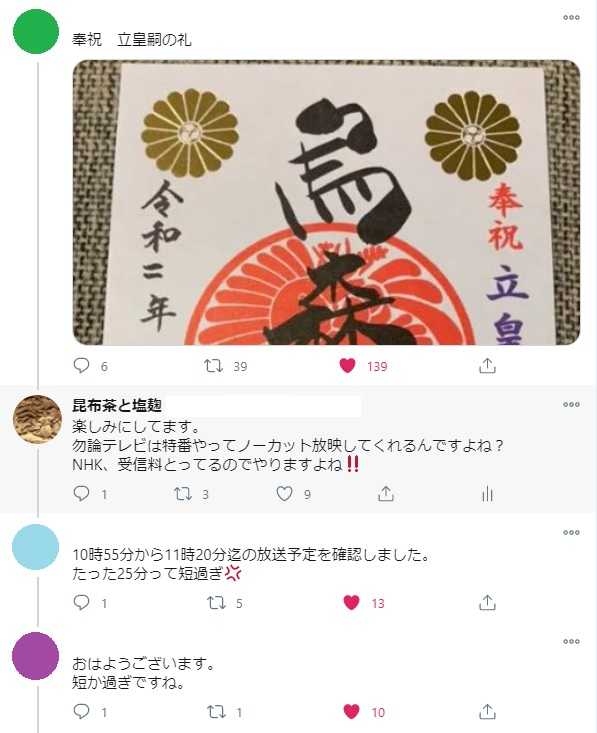 皆様こんにちは。いよいよ明後日、秋篠宮殿下の「立皇嗣の礼」が行われます。ところが、どうやら日本のマスコミは今回の「立皇嗣の礼」をきちんと報道しないみたいです。徳仁天皇の「即位の礼」の時は、どのチャンネルも即位の礼一色だったのに!「立皇嗣の礼」は、新天皇の即位の礼の一環で、最後の仕上げの儀式になります。もちろん国事行為です。新天皇が即位したのち、次の皇位継承者がきちんと決まってはじめて即位の礼が完了となります。つまり、「立皇嗣の礼」が完了していない今は、令和の即位は未完ということです。秋篠宮殿下が正当な皇位継承者になられるのは決まっておられます。今上陛下も了承しておられます。(↓画像クリックでソースにリンクします)NHK:2020年11月5日 15時24分今月8日に、秋篠宮さまが皇位継承順位1位の「皇嗣」になられたことを広く伝える「立皇嗣の礼(りっこうしのれい)」が行われるのを前に、天皇陛下は、三重県の伊勢神宮などに使者を派遣する儀式に臨まれました。天皇陛下は、5日午前11時、天皇の装束とされる「御直衣」に身を包み、装束姿の宮内庁の幹部の先導で、皇居 宮殿の「竹の間」に入られました。そして、「立皇嗣の礼」を行うことを日本古来のことばで記した「御祭文」を、小田野侍従長を通じて伊勢神宮への使者に授けられ、使者は、伊勢神宮への供え物とともに退出しました。このあと天皇陛下は、奈良県の神武天皇陵と東京 八王子市にある昭和天皇が埋葬された武蔵野陵に派遣する使者たちにも「御祭文」を授けられました。(全文はソースにて)即位の礼の一環の、大事な国事行為の儀式なのに、どうしてこういうことをきちんと報道しないのでしょうか?特にNHK。 10:55~11:20までのたった25分しか報道しないって!!「公共放送」を名乗って、安くない受信料を取っているにもかかわらず、何という蔑ろな扱い。何度も言いますが、立皇嗣の礼は「国事行為」です。今、日本の皇室を一番軽んじているのは、間違いなく既得権益のマスコミですね。国民を間違った方向に導こうとしているのに明らかに偏向報道をしているのに既存マスコミの電波使用料に切り込まない総務省。携帯電話よりも明らかに既存マスコミの電波使用料の方が不当に安いですよ。(ビジネスジャーナル:2013.5.7)↓クリックで記事にリンクしますテレビ局の電波利用料負担、携帯会社のわずか10分の1? テレビ局と総務省の利権か(一部抜粋します)自民党の河野太郎衆議院議員は総務省に「テレビ局ごとの電波利用料の負担金額を出してほしい」と要求したところ、総務省の担当課長は「個別の負担金額は開示しておりません」と答えたらしい。さらに河野氏が「どうして出さないのか」と尋ねると、その課長は「テレビ局のプライバシー」だと答えた。その後、自民党が総務省に強く要請し公開が決まったようだが、今回の発表でわかったのは、テレビ局がボロ儲けしている実態だ。 テレビ局全体の電波利用料負担は、総計で34億4700万円にしかならないのに対し、営業収益は3兆1150億8200万円もある。電波の“仕入れコスト”は、営業収益のわずか0.1%ということになる。 そもそも電波利用料とは何か? 電波法や総務省の資料によると、「電波利用共益費用」、つまり「電波の適正な利用の確保に関し無線局全体の受益を直接の目的として行う事務の処理に要する費用」の財源に充てるため、テレビ局やラジオ局、携帯電話会社など無線を利用する者が支払うものとなっている。要するに、違法電波による混信障害などから電波環境を守るための経費を徴収するという名目でつくられた制度だ。 電波利用料を支払っているのはテレビ局などの放送局だけではない。電波を使っている携帯電話会社も支払っており、全額通話料として携帯電話ユーザーに転嫁されている。具体的には、携帯電話1台につき年200円だが、携帯の支払い明細書に「電波利用料」という記載がないので、利用者が知らないのも無理はない。 12年度の電波利用料収入は約715億円の見通しで、内訳は携帯電話事業者が72.3%なのに対し、放送事業者はたったの7.2%である。NHKは電波利用料を受信料に転嫁しているし、民放は企業が支払うCM料に転嫁している。つまり、電波利用料のほとんどは、携帯電話を使っている消費者が負担しているといってよいだろう。地上波ではあまり報道されないかもしれませんがインターネットの政府広報チャンネルでは11月8日(日)11時~、立皇嗣の礼を放送してくれるそうですので皆さん、ネットで見ましょう!(↓の画像で、チャンネルにリンクしますので、 今のうちにブックマークをぜひ!!)https://www.gov-online.go.jp/sp/rikkoushinorei/index.htmlネットの拾いものですが・・・まさに今こんな状況です。