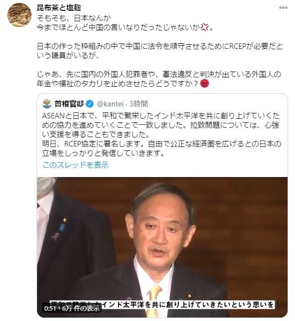 皆様こんにちは。「明日RCEPに署名する」と、今日、官邸から発表がありました。(↓クリックで首相官邸の動画ツイートにリンクします)これ(日本のRCEP参加)について、自民党の議員は、「中国にやりたい放題させないために、日本が作ったRCEPの枠組みの中で中国に法律を順守させるため」だと言っていますが、これについての私の意見は、上記ツイートの通りです。しかもFFさんに教えてもらったのですが、RCEPは秘密裏交渉で内容が出てない。確かに今まで出した外務省HPのRCEPの資料も「概要」ばかりで「内容」は見つけられませんでした。今年のコロナで、日本国内で中国人がマスクを買い占め、消毒液を買い占め日本中の医療機関や国民を窮地に追い込んだのを知っての発言でしょうか?そもそも、個人レベルで他国に来てまでその国の法律を遵守しないばかりか法の抜け穴を利用して太陽光発電だの、農作物の盗難に密漁など、やりたい放題やっているのに、彼らの母国や政府が法令を遵守するでしょうか?貧乏だから仕方ない。・・なんて同情論はもう通用しません。未だそんなことを言ってる国会議員は頭の中がアップデートされてない証拠ですから即刻退場してもらいたい。国と国民のために働かない議員はいりません。少なくとも中国は日本を抜いて世界2位の経済大国でしょう。何で日本が、自分より格上の国にODAやら各種補助金やらを支出しないといけないんだよ?自国の国民くらい、自国で面倒見ろ!・・・と思います。「中国共産党と個人の中国人は違う(中国人の中にはいい人もいる)」と言う人もいますが(勿論それについて全面的に反対するものではありません。)今、コロナで各国が海外往来について待機期間を設けている時に中国共産党一党独裁の国から、易々と自国の国境を越えられる人来日し、日本に滞在できる人(主に中流層以上の中国人)はもれなく中国の共産党員です。企業も同じくです。中国に民間企業などありません。日本人は中国共産党の怖さを知らなさすぎます。「なんでもあり」なんですよ。自分の思い通りにするためなら、どんな手も使います。「法は自分以外の他人を縛るもの」という考え方ですよ。このRCEP、国会議員からはほとんど反対の声が聞こえてきません。(私の不勉強かもしれませんので、もし、RCEP反対を主張している議員をご存知でしたら、コメント欄でお知らせください)国会議員たちの危機管理、甘すぎやしませんか?たかが消耗品のマスク1枚、消毒液1本で、日本は、国内の医療崩壊寸前まで追い込まれたのですよ。しかも、そのウイルスは中国の武漢発祥です。日本が損害賠償を請求してもいいくらいのものですよ。自民党は間違いなく2度、裏切りました。1度目は安倍総理の時。TPP反対を掲げて選挙に大勝したのに、選挙に通ったらTPP傘下に回りましたね。そして2回目はこのRCEP。それ以外にもアイヌ法案の可決や、ヘイトスピーチ法など、どっちを向いて政治をしているのでしょうか。いい加減に、政治家という「人」を信じるのはおやめなさい。安倍総理が言っていましたが、「政治は結果」なのです。であれば、自民党政権の結果はこれです。令和2年警察白書より令和元年中の来日外国人による刑法犯の検挙件数に占める共犯事件の割合は31.5%と、日本人(10.3%)の約3.1倍に上り(※注)、極めて高い割合となっている。罪種別にみると、住宅を対象とした侵入窃盗で78.0%と、日本人(16.4%)の約4.8倍に上る。このように、来日外国人による犯罪は、日本人によるものと比べて組織的に敢行される傾向がうかがわれる。※注:来日外国人と日本人の共犯事件については、主たる被疑者の国籍・地域により、来日外国人による共犯事件であるか、日本人による共犯事件であるかを分類して計上している。窃盗は,ベトナムが2,428件(検挙人員888人)と最も多く,次いで,中国998件(同767人),ブラジル573件(同138人)の順であった。傷害・暴行は,中国が267件(同327人)と最も多く,次いで,韓国・朝鮮110件(同108人),ブラジル100件(同105人)の順であった(警察庁の統計による。)(↑令和元年警察白書よりグラフと解説を抜粋)以前のRCEPやTPPの時にお話ししたように、国際条約というのは、国同士の約束事ですから、各国の法律や憲法よりも上位にあり、優先されます。・・・であれば、今この状態で、しかもコロナや各種感染症の心配がある状態で軽々しくRCEPに参加するべきではありませんし、そもそもインドが脱退した後、RCEPに参加するメリットが見当たりません。今の日本は、コロナによる春のロックダウンの影響が続き経済は低調、国内失業者は7万人を超えています。(下記新聞記事参照)外国人を受け入れるよりも日本人を守ってもらいたい。